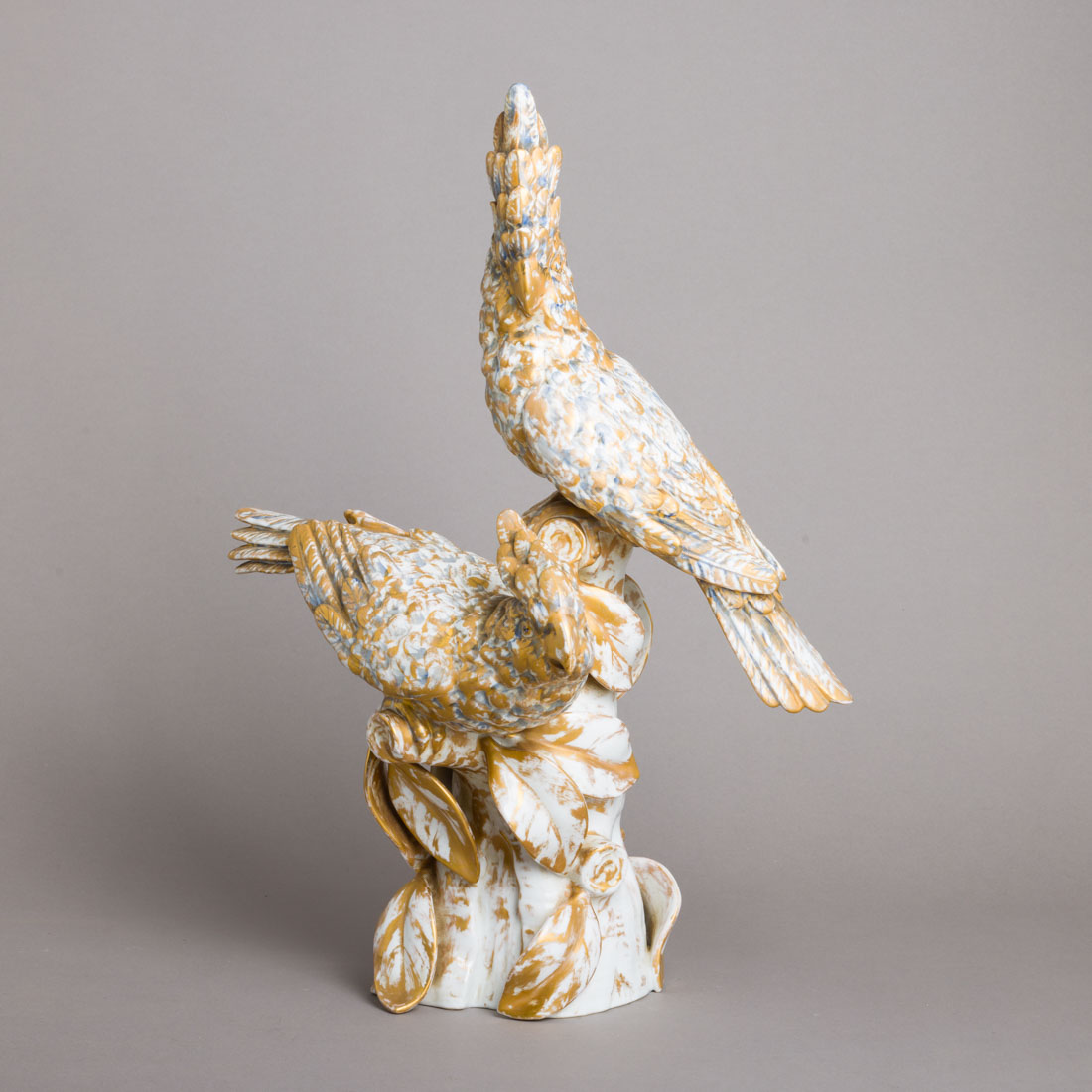 Grupo escultórico em porcelana moldada (1968-1971), decoração a azul e a dourado. Sinais de uso e uma folha colada.