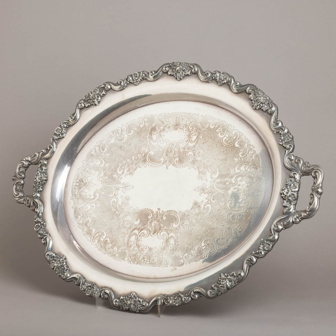 Em metal prateado, decoração com gravados, bordo relevado "enrolamentos e flores", marcado EPC Poole Silver Co 400, Lancaster Rose. Sinais de uso, ligeiro desgaste e pequena amolgadela.
