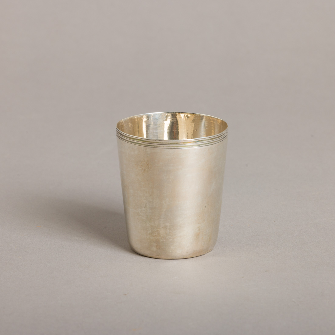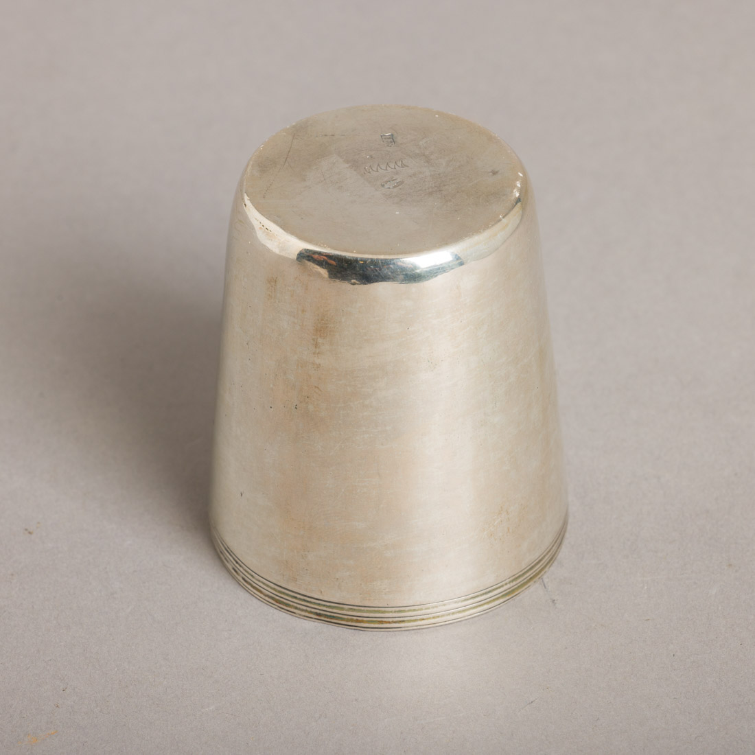 Em prata portuguesa do séc. XIX, marca de ensaiador de Lisboa (L-35) José Joaquim da Costa e de ourives (L-315) João Luís Freire, decoração lisa com frisos. Pequenas amolgadelas.