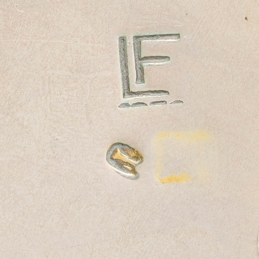 Em prata portuguesa, mascas com desgaste, marcada "LF" e marca de ourives do Porto José Pereira Reis (1916-1990), decoração relevada e medalhão "figura clássica". Sinais de uso, pequenas amolgadelas.