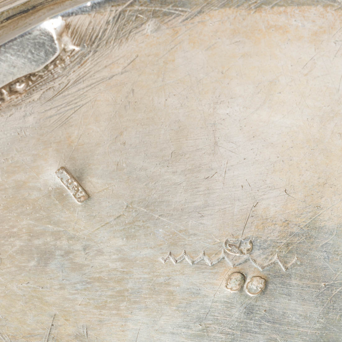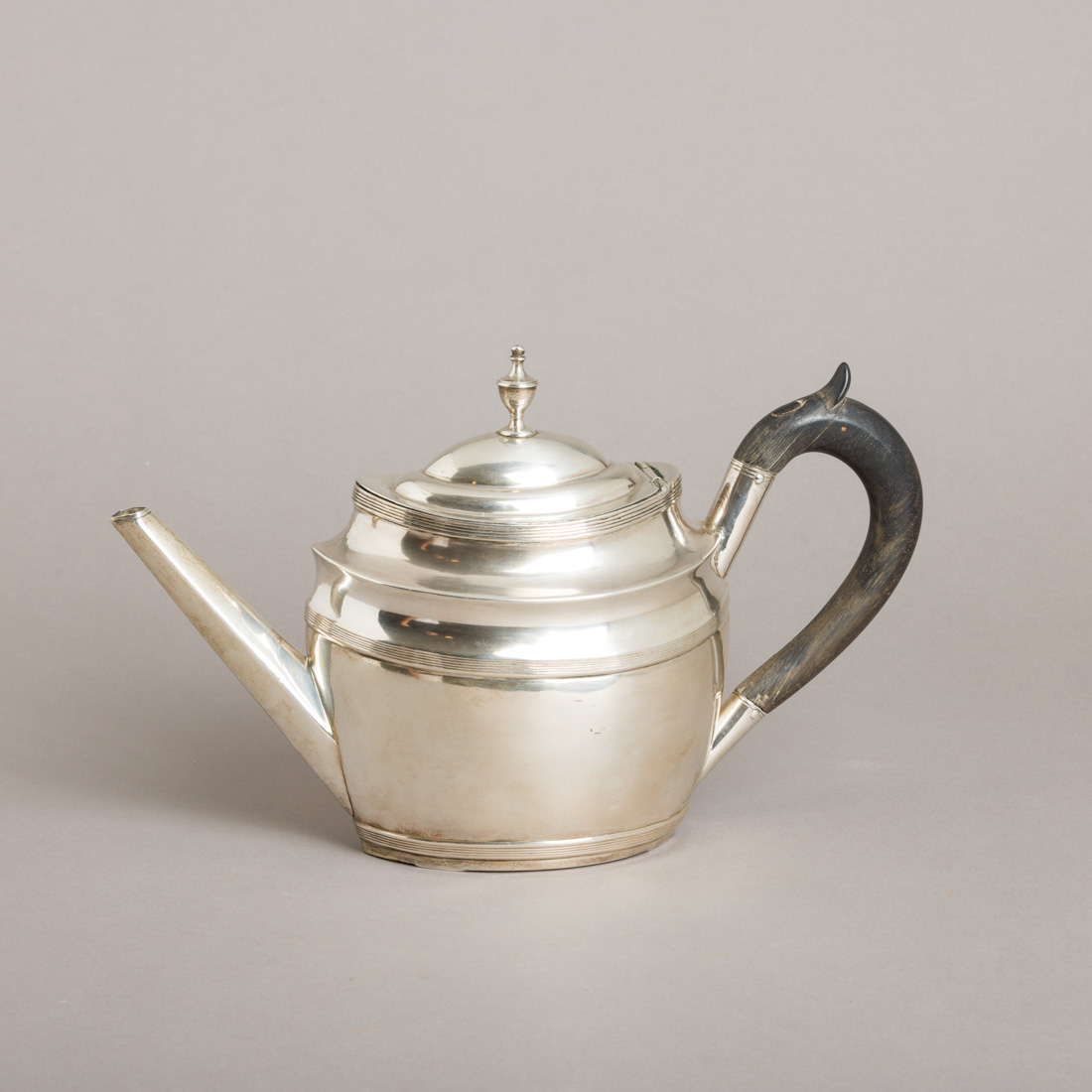 Em prata portuguesa do Séc. XIX, marca de ensaiador de Lisboa (L-38) datável de 1810-1822 e de ourives (L-107) António José da Mota, duplamente remarcada Cabeça de Velho, decoração lisa. Leves amolgadelas, pega em madeira com defeitos. Peso aprox.: 818 g. Dim.: 19 cm.
