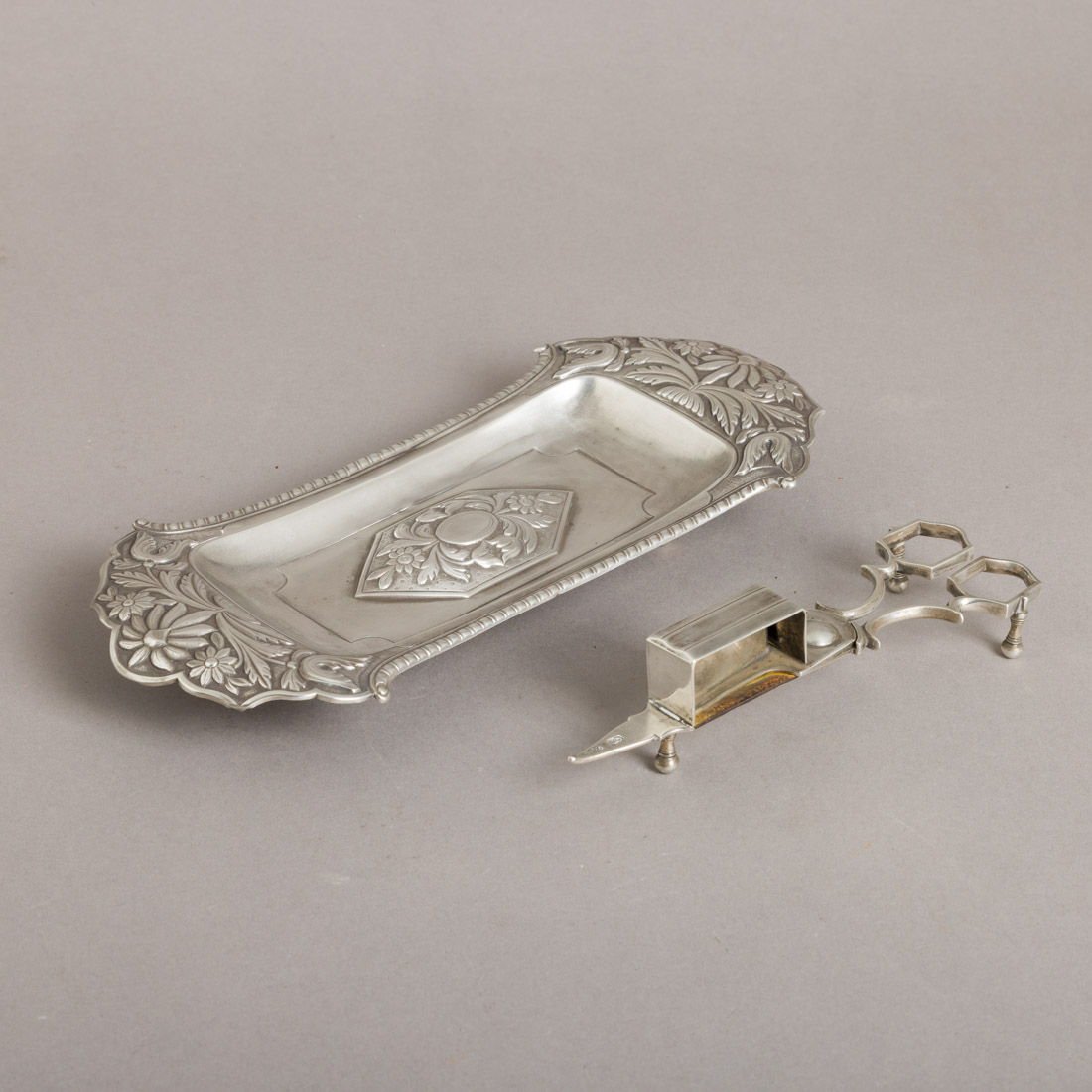 Em prata portuguesa do Séc. XIX, marca de ensaiador do Porto (P-34) Luís António Rodrigues e de ourives (P-171) datável de 1836-1853, bandeja relevada decorada "flores". Sinais de uso, pequenas amolgadelas.