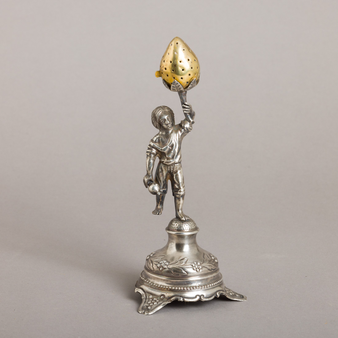 Em prata portuguesa contraste javali (1887-1937) de 833, decoração relevada, parcialmente dourado, base redonda. Sinais de uso e pequenas amolgadelas.