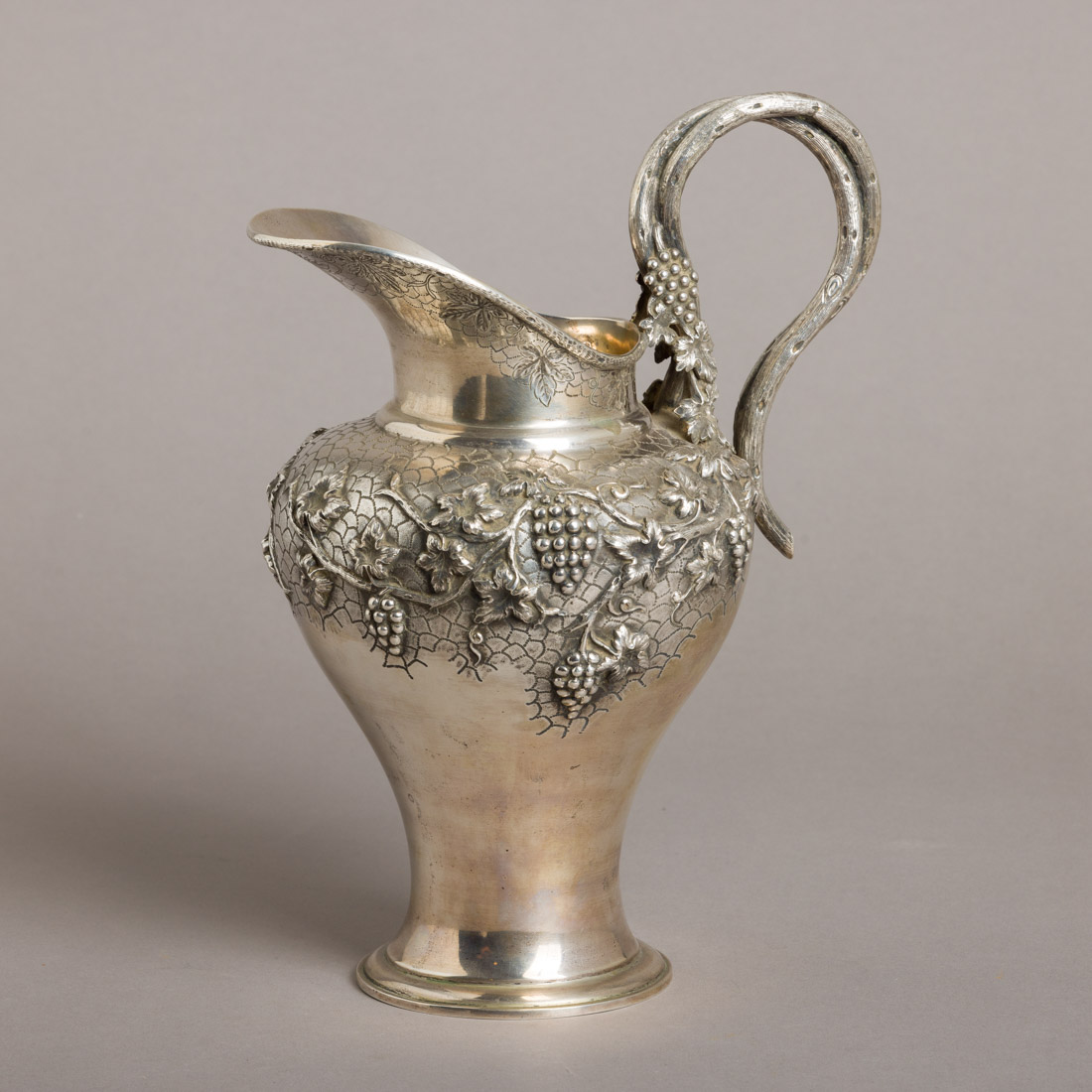 Em prata portuguesa contraste javali (1887-1937) de 833, marcada Ourivesaria Guia - Lisboa, decoração relevada e gravada com parras e uvas. Sinais de uso.