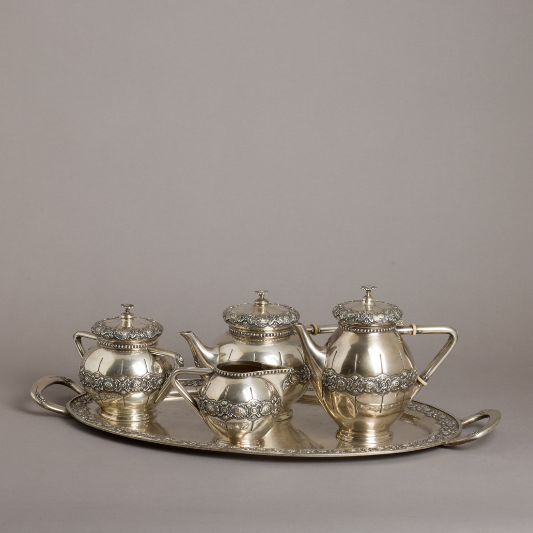 Em prata portuguesa contraste javali (1887-1937) de 833, marcada Reis & Fos, Lda. - Porto, decoração relevada. Composto por bule, cafeteira, leiteira e açucareiro. Pequenas amolgadelas. Peso aprox.: 3465 g. Dim. Cafeteira: 19,5 cm. Bandeja: 60,5x32,5 cm.