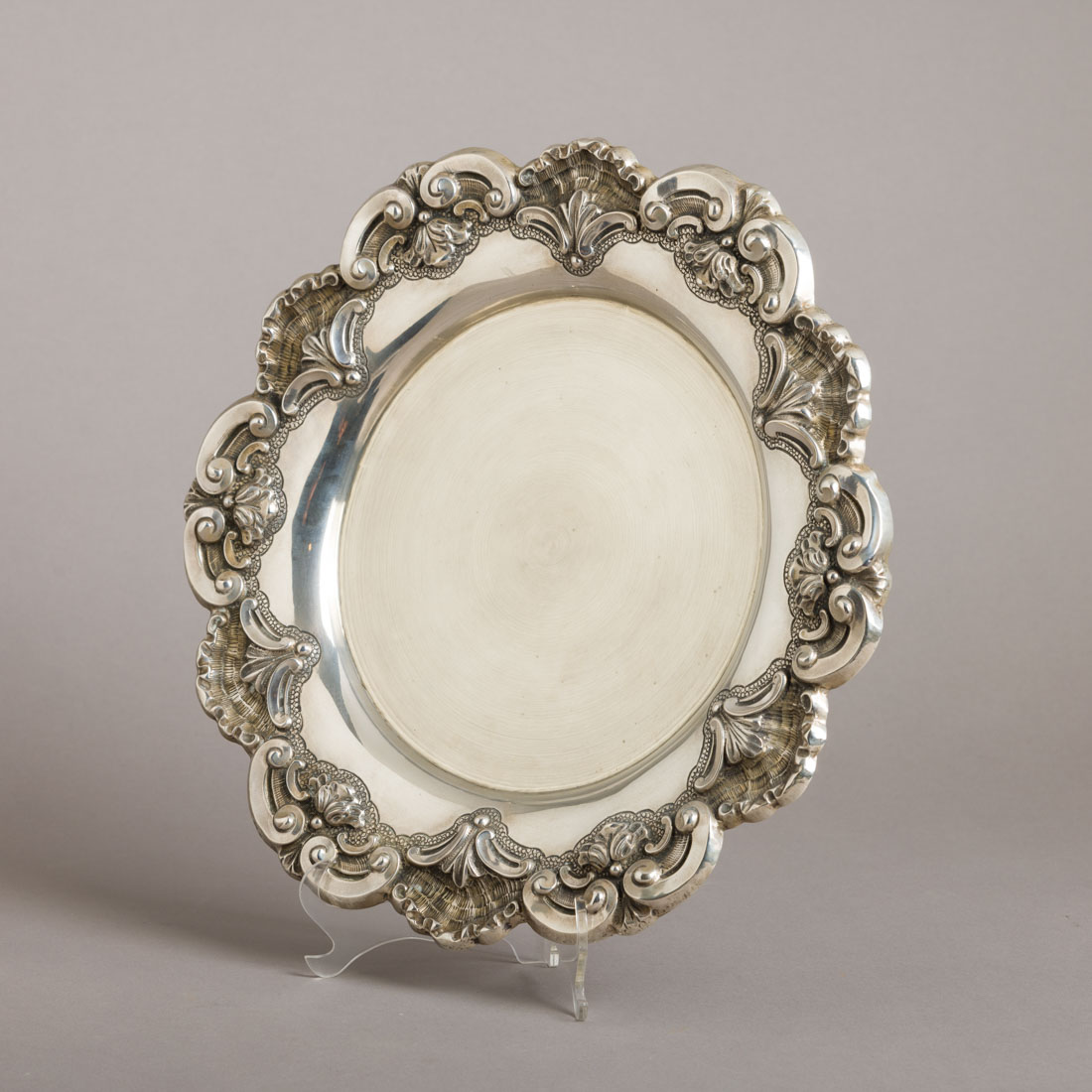Em prata portuguesa contraste águia (1938-1984) de 833, aba relevada decorada com enrolamentos e concheados. Sinais de uso, leves amolgadelas.