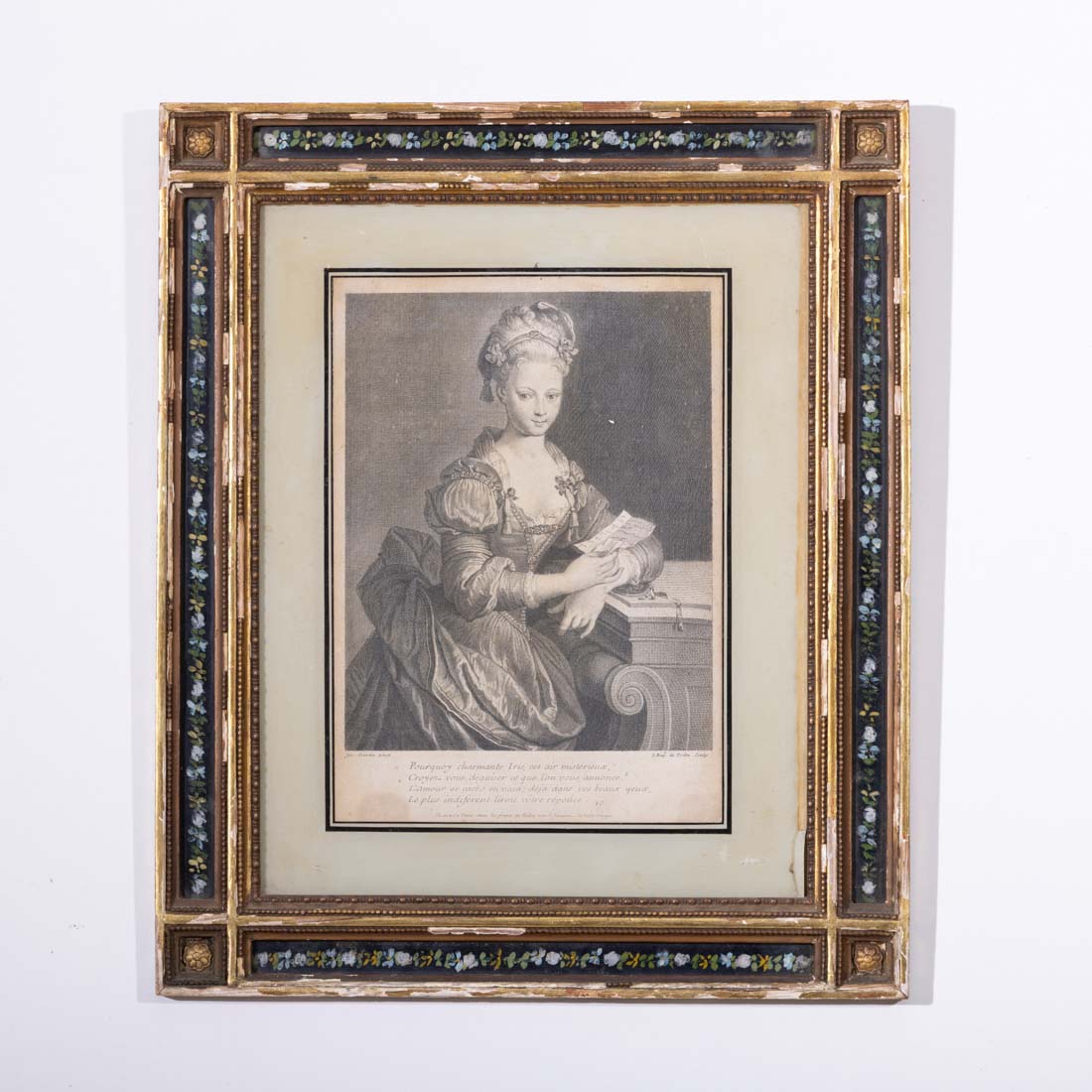 Gravura sobre papel. Francesa, gravada por Jean Baptiste de Poilly (1669-1728). Manchas. Moldura em madeira dourada e vidro pintado "flores", com falhas e pequenos defeitos.