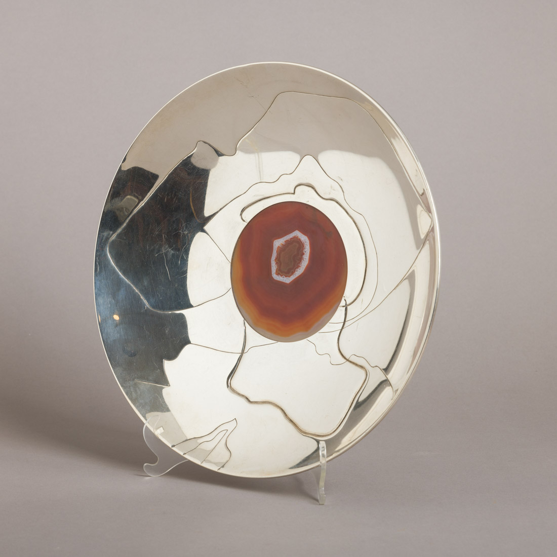 Em prata portuguesa contraste águia (pós 1985) de 925, marcada Flamingo, decoração gravada, aplicação de placa em ágata. Sinais de uso.
