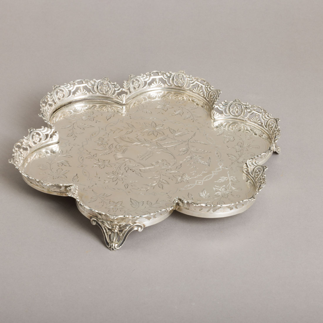 Em prata portuguesa contraste javali (1887-1937) de 833, decoração gravada com gravada com elementos vegetalistas, gradinha vazada, monogramada e datada. Sinais de uso.