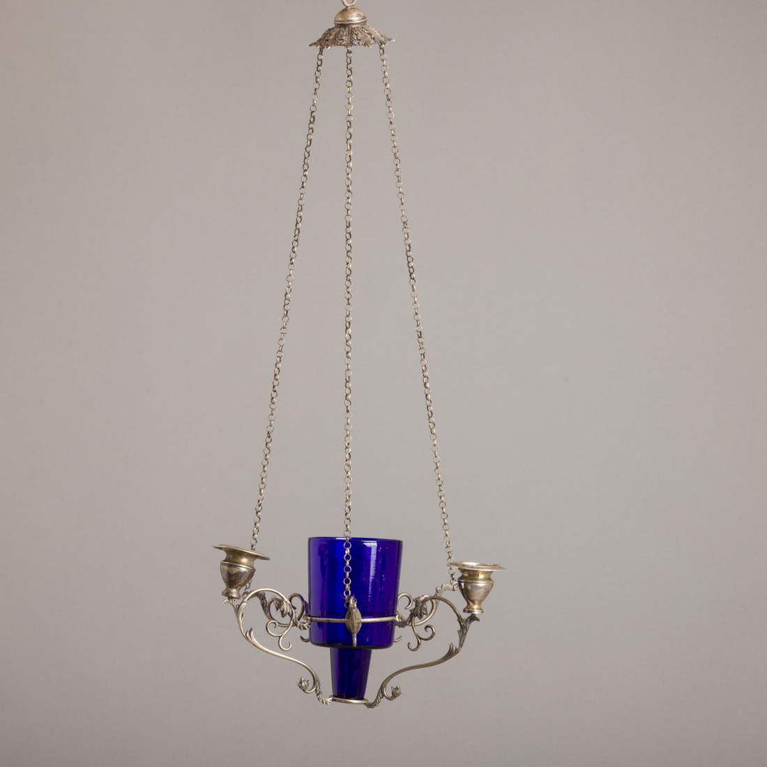 Em prata portuguesa contraste águia (1938-1984) de 833, decoração relevada com elementos vegetalistas, taça em vidro azul. Electrificado. Sinais de uso.