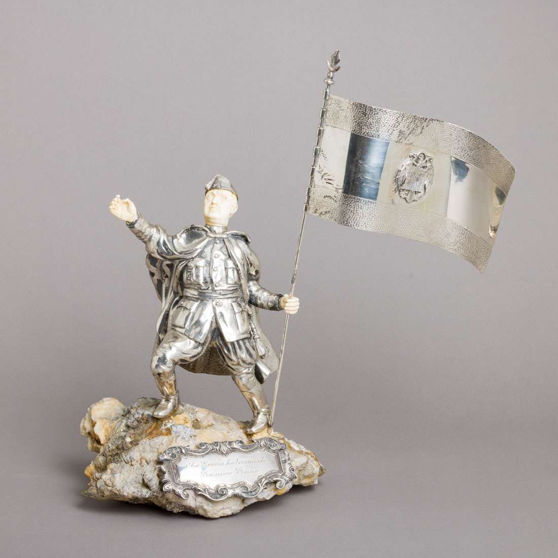 Escultura em prata espanhola, mãos e cabeça em matéria orgânica, base em quartzo, assinada e numerada nº. 351. Sem marcas, ao abrigo do Decreto-Lei n.º 120/2017. Pequenos defeitos.