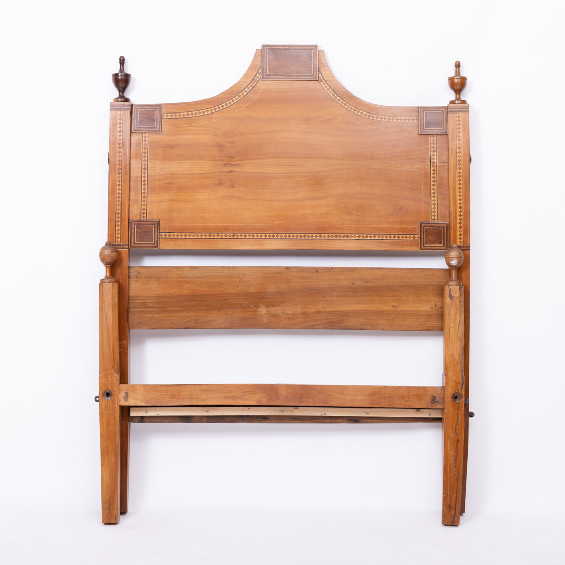 Estilo D. Maria, em diferentes madeiras com marchetaria, cabeceira recortada. Pequenos defeitos e restauros.