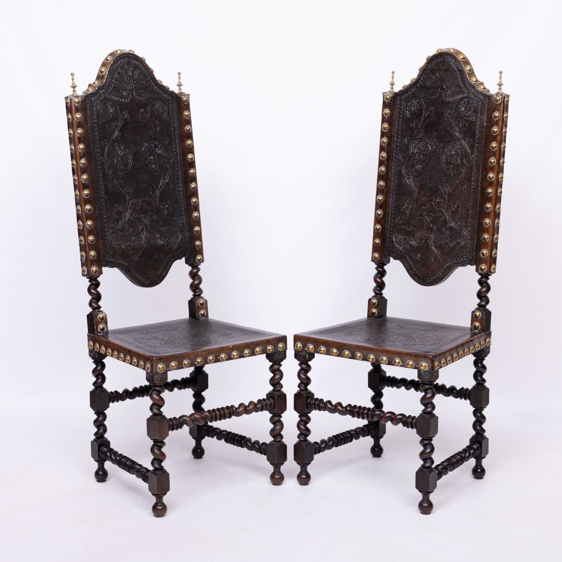 Em castanho, pernas torneadas, espaldares e assentos em couro lavrado com pregaria. Sinais de uso, pequenos defeitos.