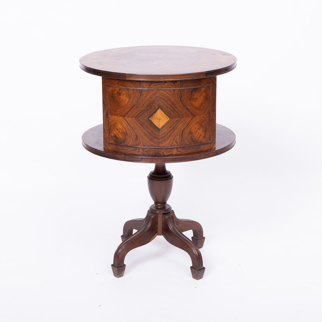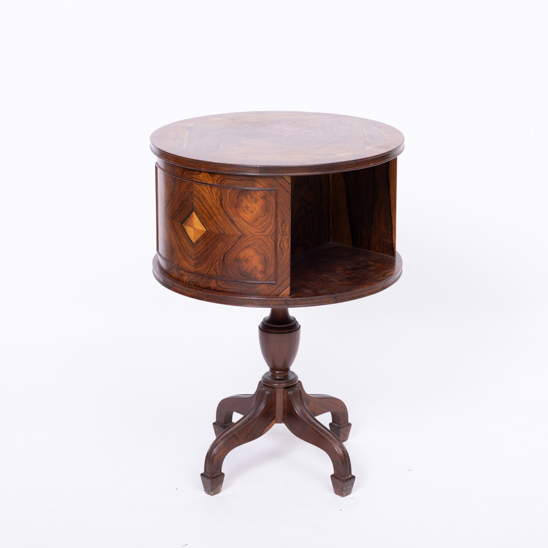 Ao gosto inglês, em pau santo e folheada a pau santo, coluna central torneada e pés curvos. Pequenos defeitos.