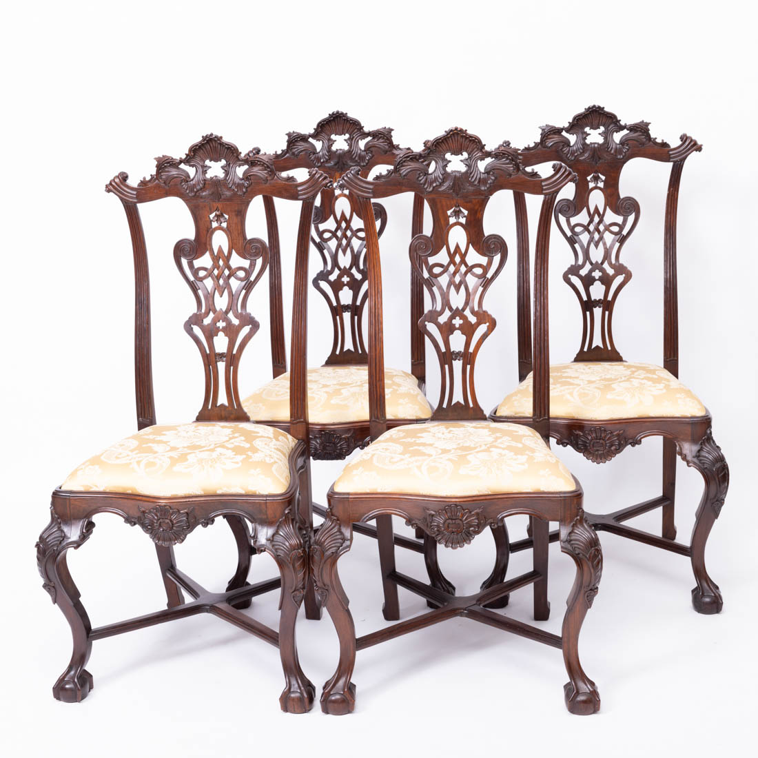 Estilo D. João V/D. José, em pau santo com entalhamentos, espaldares com cachaços entalhados e vazados, tabela central recortada e vazada, assentos estofados a seda adamascada. Séc. XIX. Sinais de uso, pequenas falhas.