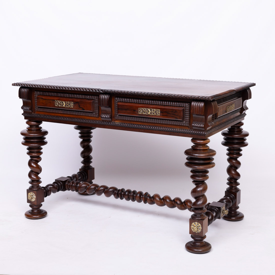 Em pau santo, pernas e travejamentos torneados e espiralados, de duas gavetas, simulando quatro, ferragens em metal amarelo. Sinais de uso e pequenos defeitos.