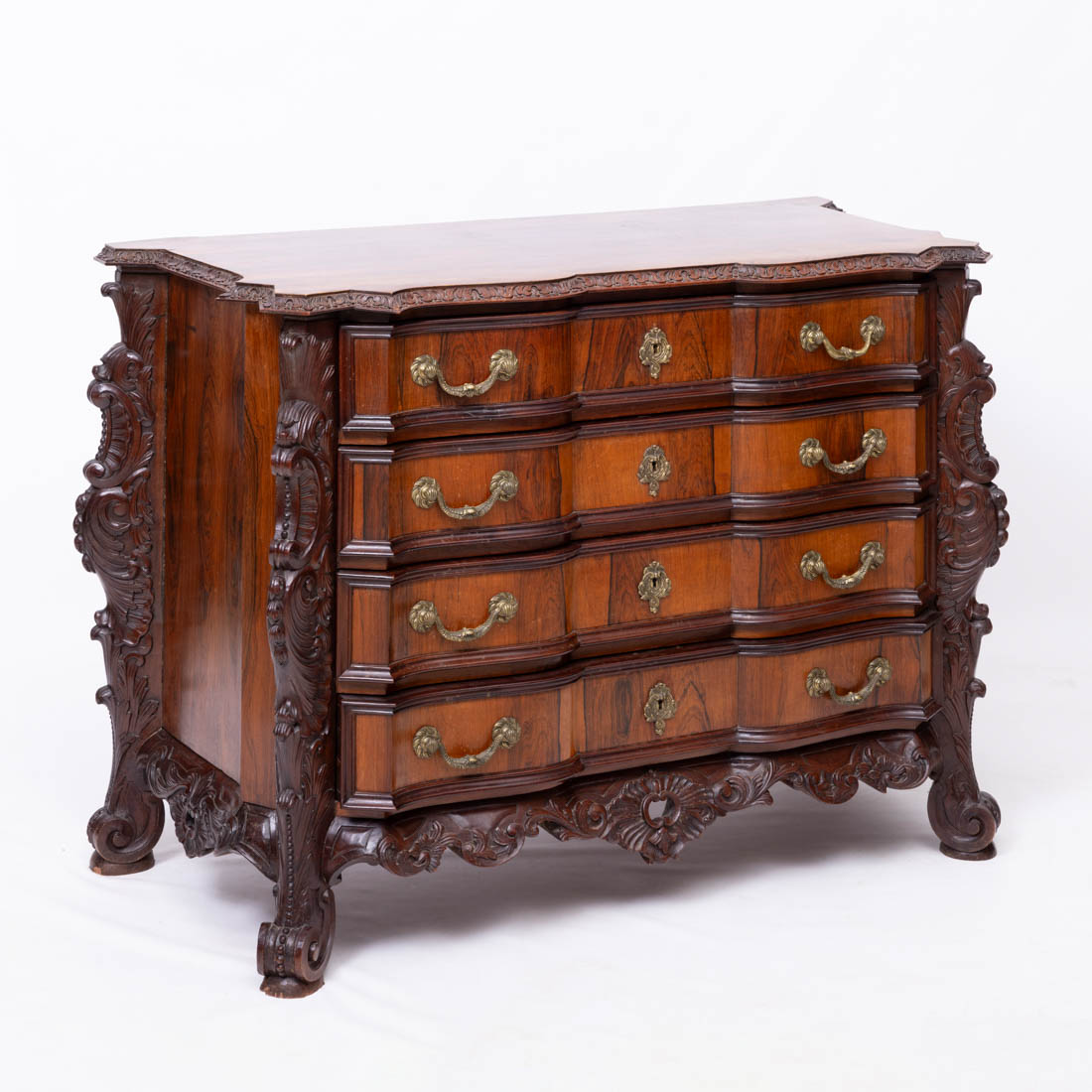 Estilo D. José, em pau santo e folheada a pau santo com entalhamentos, de quatro gavetas, tampo recortado. Sinais de uso, pequenos defeitos.