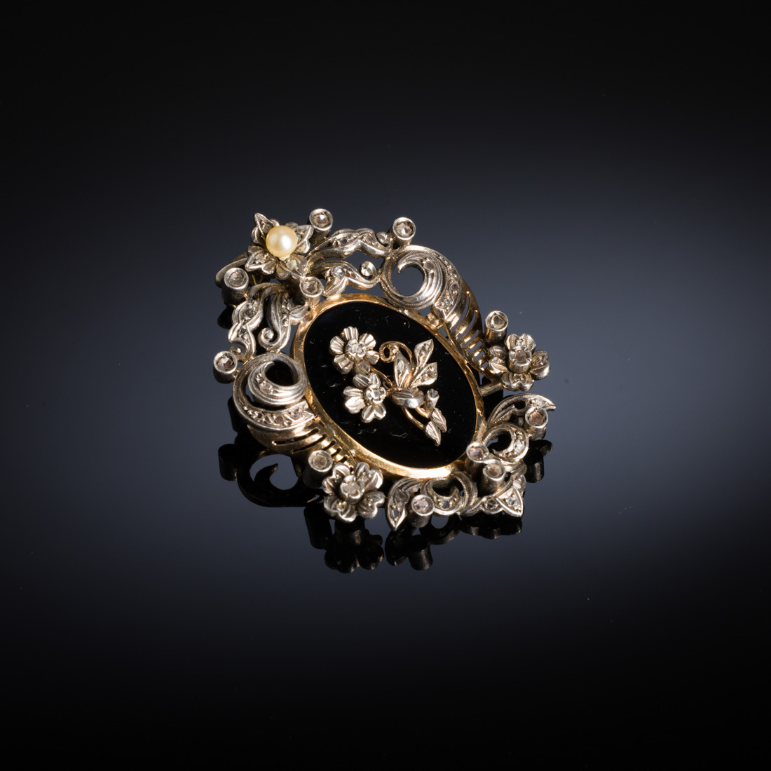 Em ouro e prata contraste galo (1938-1984), cravejado com diamantes talhe rosa, perola de cultura (não testada) e placa em ónix. Pequenos defeitos.