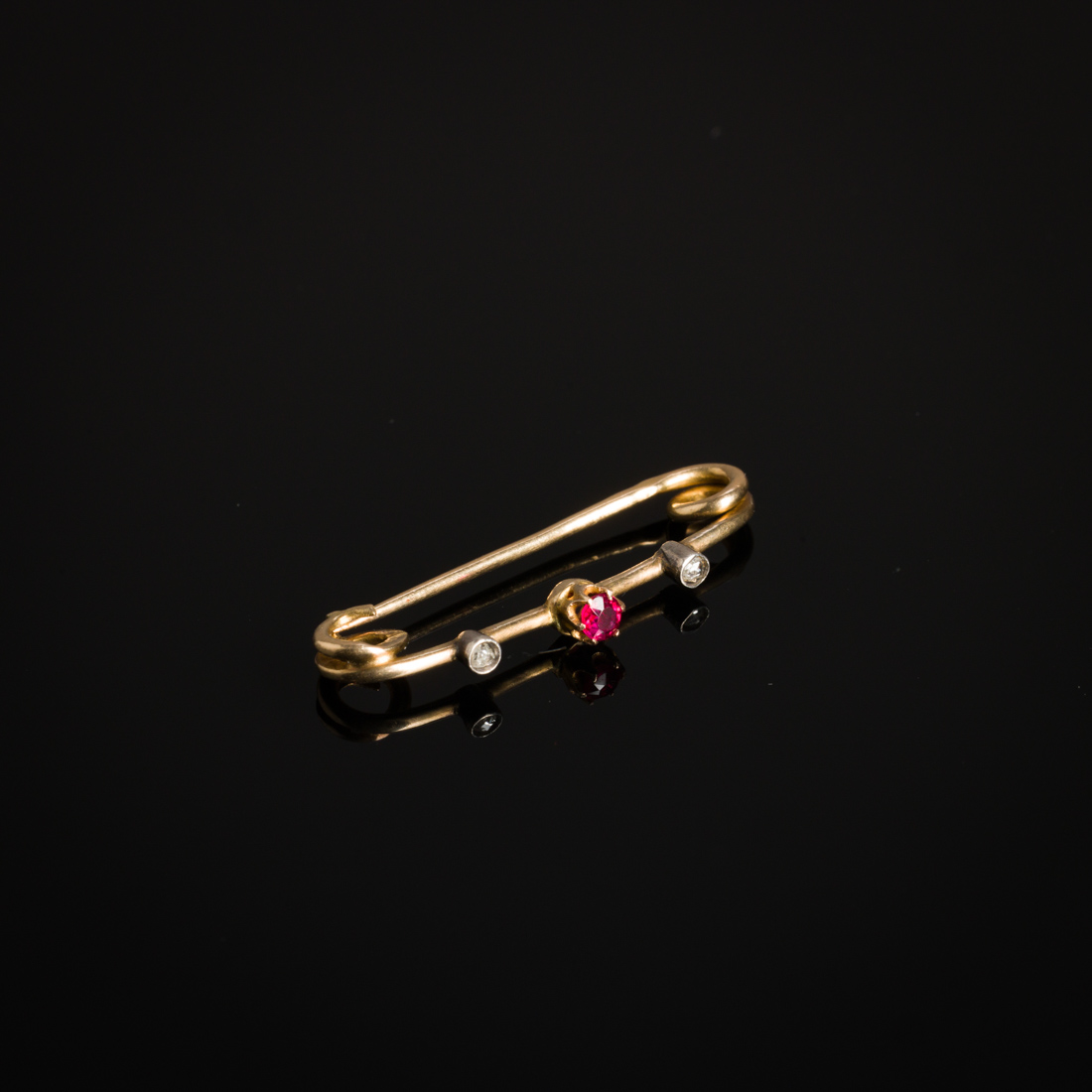 Em ouro de 19.2Kt., contraste tigre (1887-1937), cravejado com rubi e dois diamantes em talhe rosa. Sinais de uso.