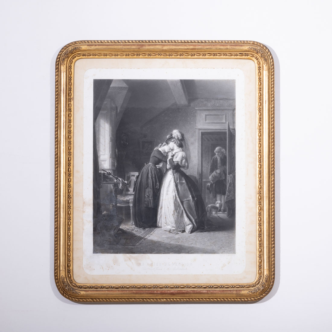 Litografia sobre papel, gravado por Herman Eichens. Séc. XIX. Moldura em madeira e gesso entalhado e dourado "flores". No verso etiqueta do Salão Silva Porto. Inúmeras manchas e defeitos.