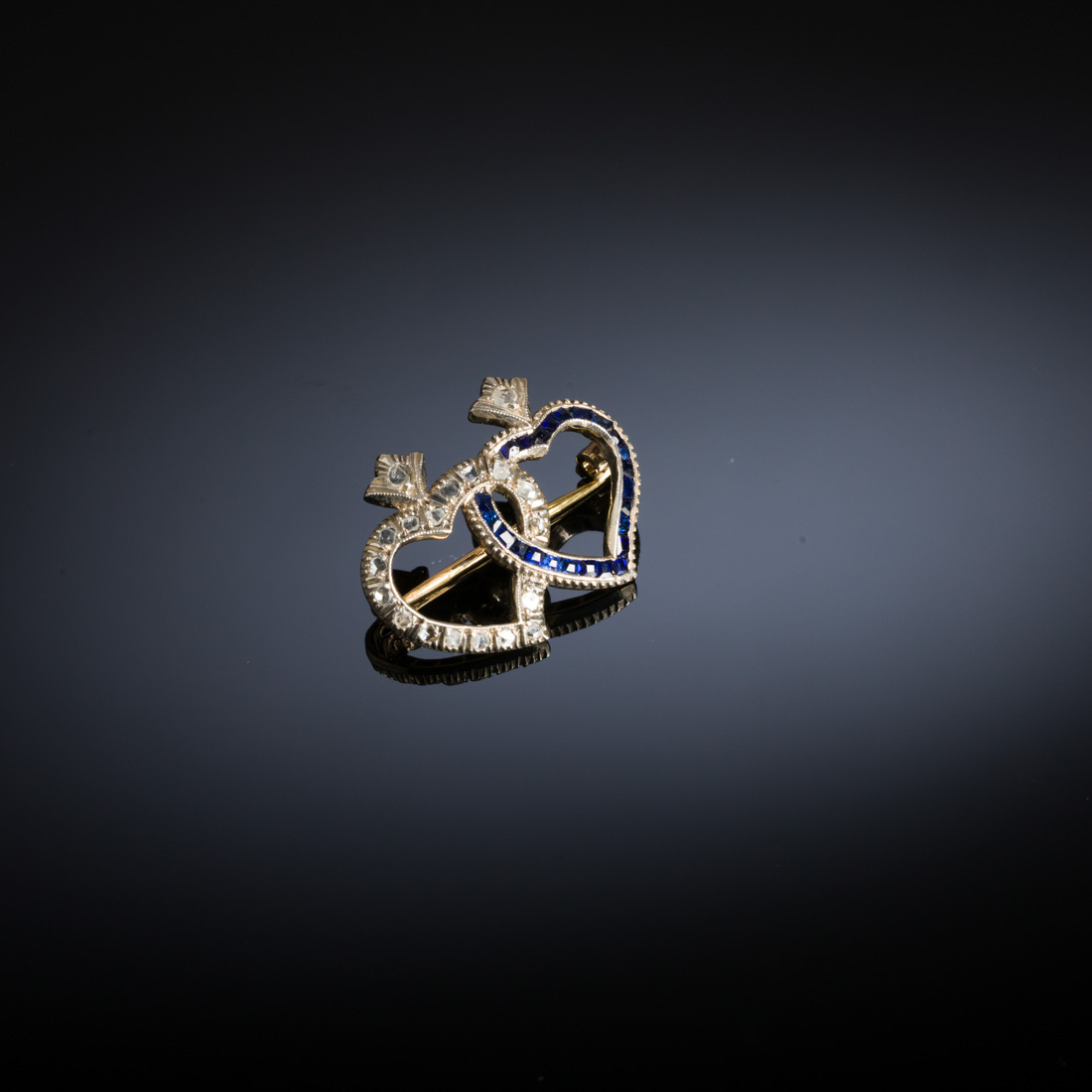 Em prata e ouro, cravejado de safiras em talhe carré e diamantes em talhe rosa. Sem marcas, ao abrigo do Decreto-Lei n.º 120/2017. Sinais de uso.