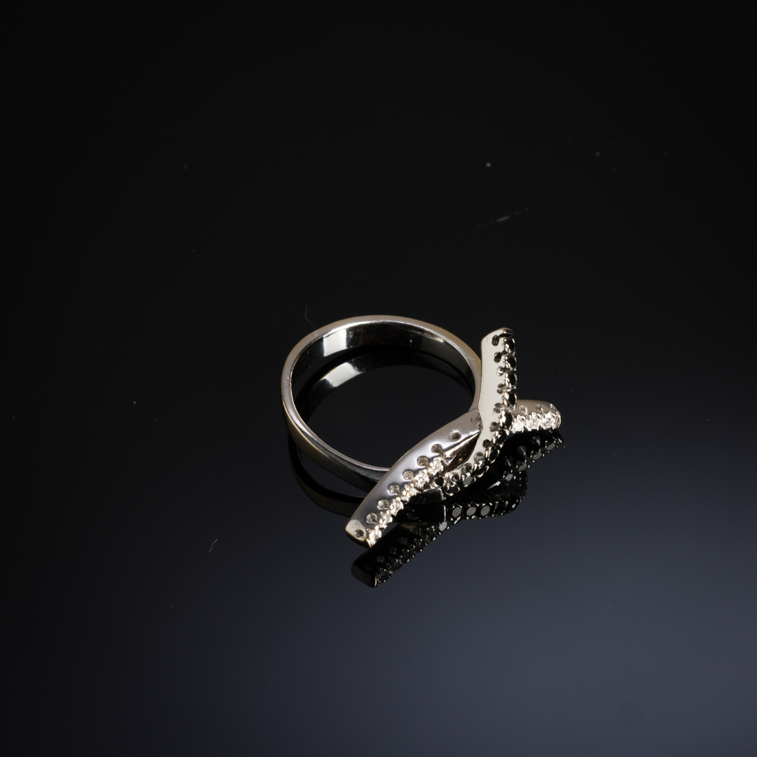 Em ouro branco português de 19,2Kt., contraste veado (pós 1985) cravejado com diamantes negros e brancos em talhe de brilhante. Sinais de uso.