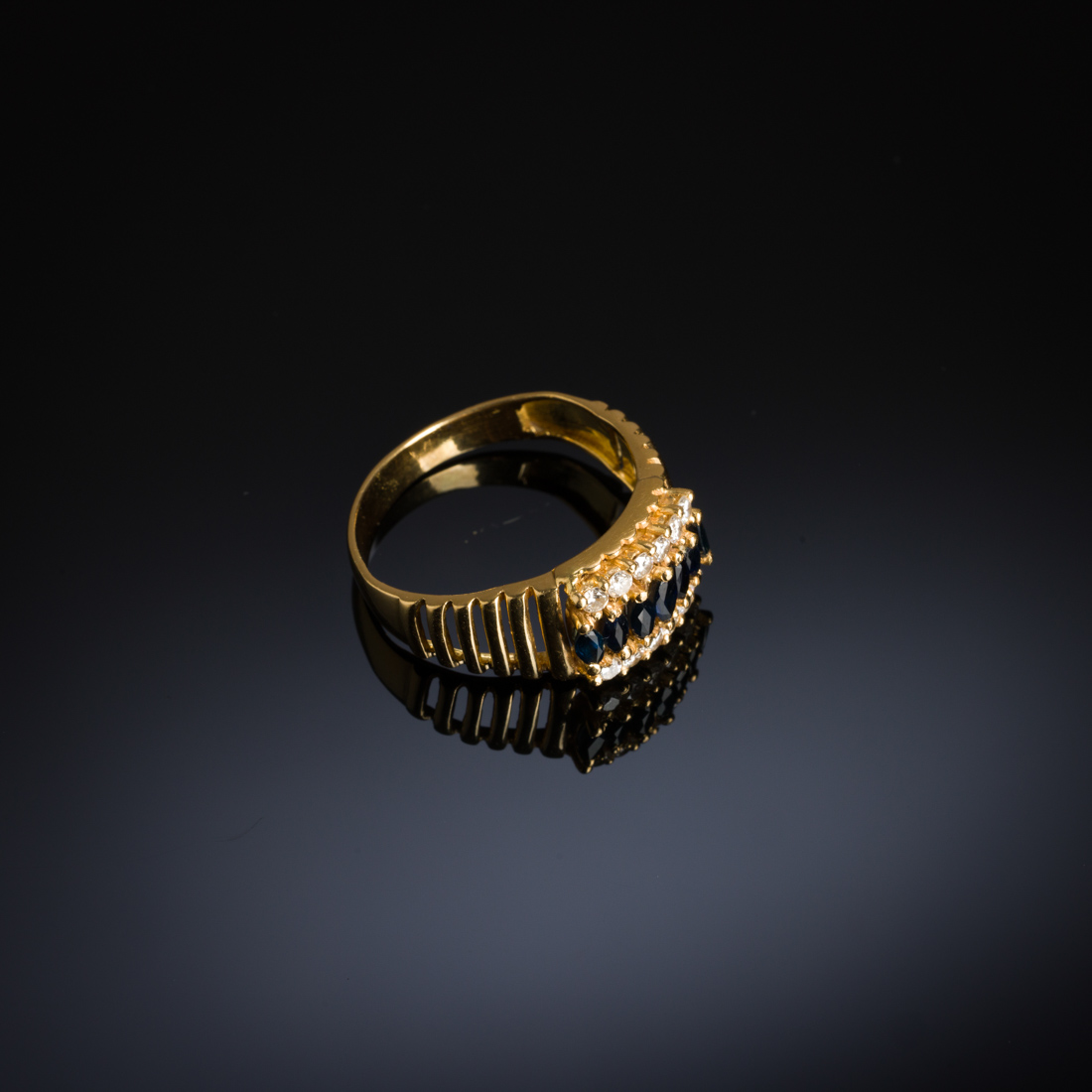 Em ouro português de 19,2Kt., contraste veado e galo (pós 1985) cravejado com sete safiras australianas em talhe navette e doze diamantes em talhe de brilhante. Sinais de uso.