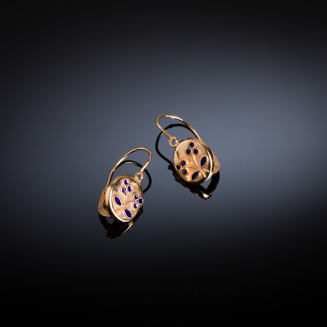 Em ouro português de 19,2Kt., contraste veado (pós 1985) com flores em esmalte azul. Sinais de uso, um com ínfimo restauro.