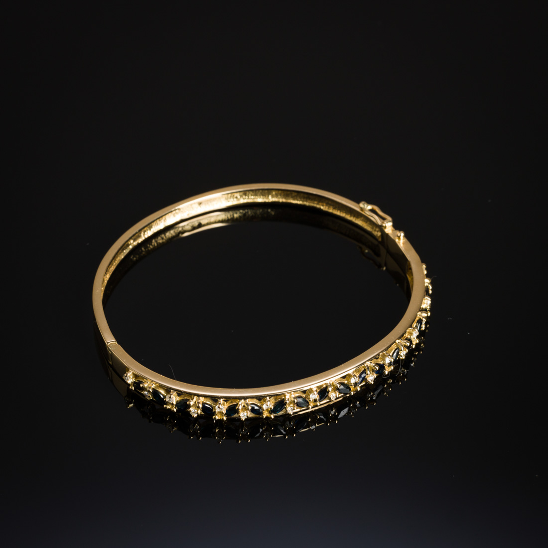 Em ouro português de 18Kt., contraste andorinha (pós 1985) cravejado com safiras australianas em talhe navette e diamantes em talhe de brilhante. Sinais de uso.