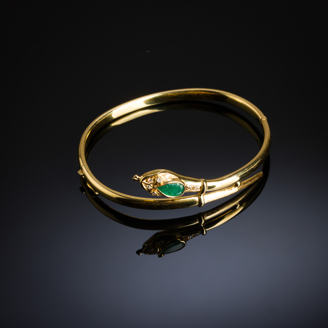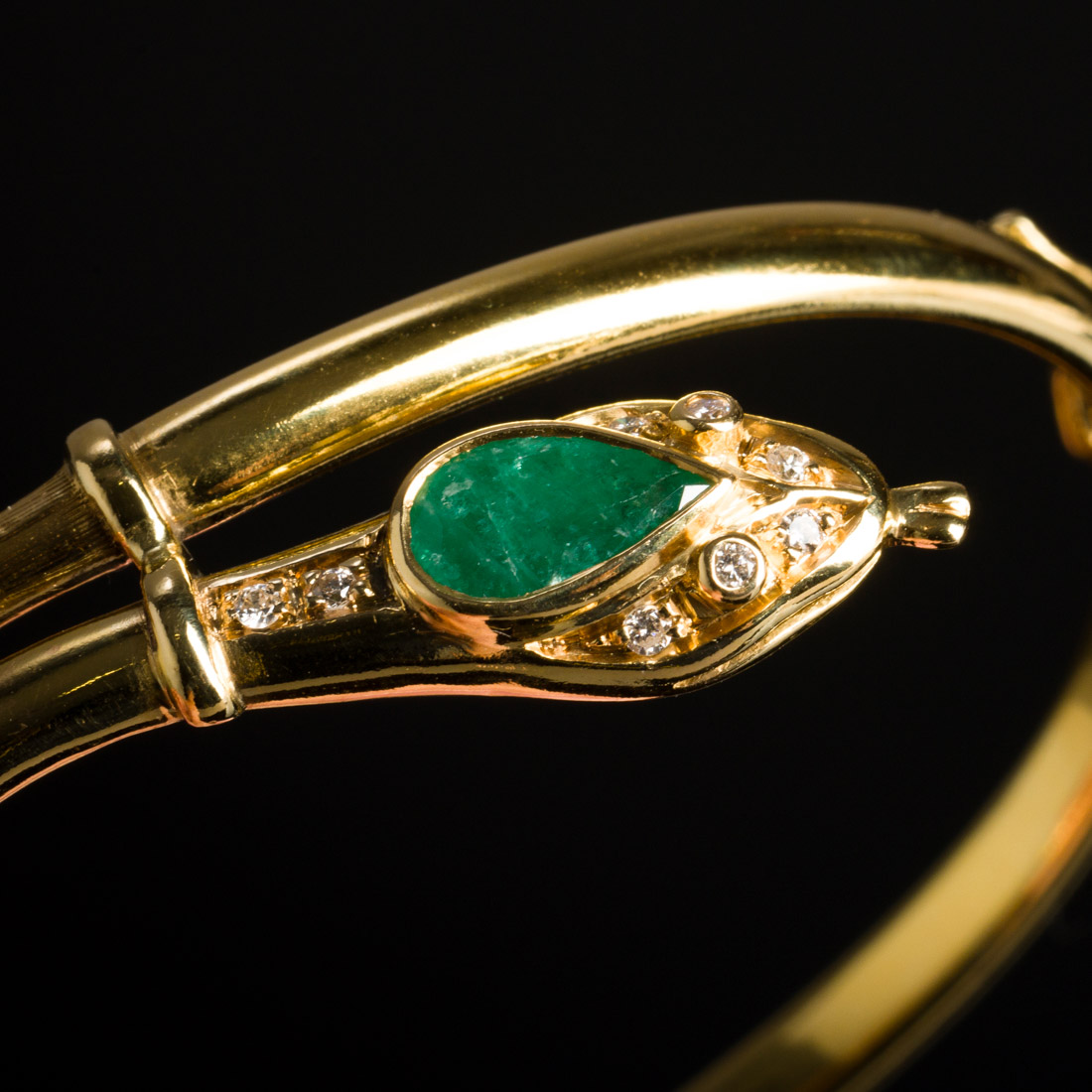 Em ouro português de 19,2Kt., contraste veado (pós 1985) cravejado com esmeralda em talhe gota e diamantes em talhe de brilhante. Sinais de uso.