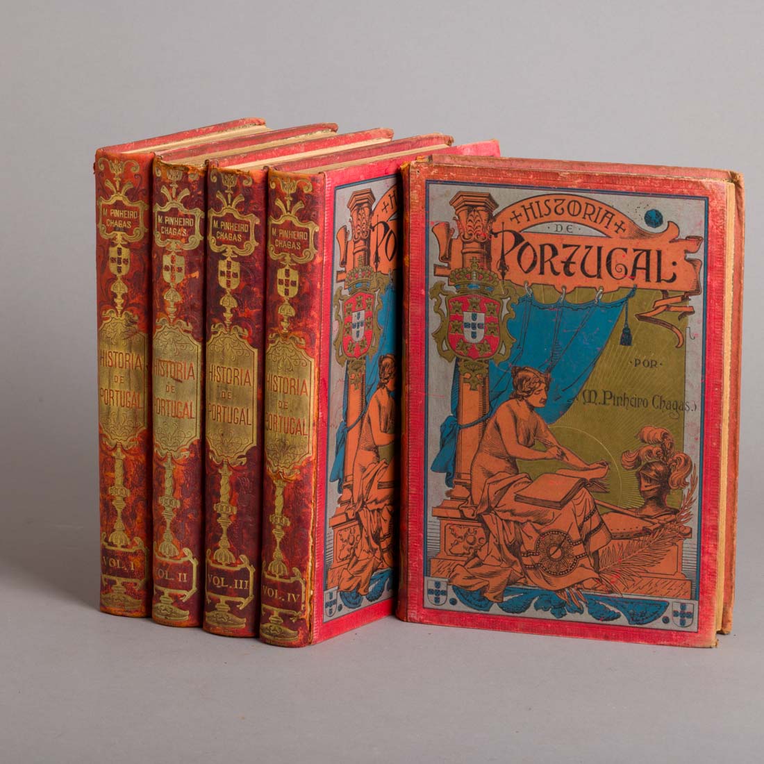 Cinco volumes da obra popular e ilustrada de Manuel Pinheiro Chagas, 3ª edição pela Empreza da História de Portugal 1849. Sinais de uso e picos de acidez.