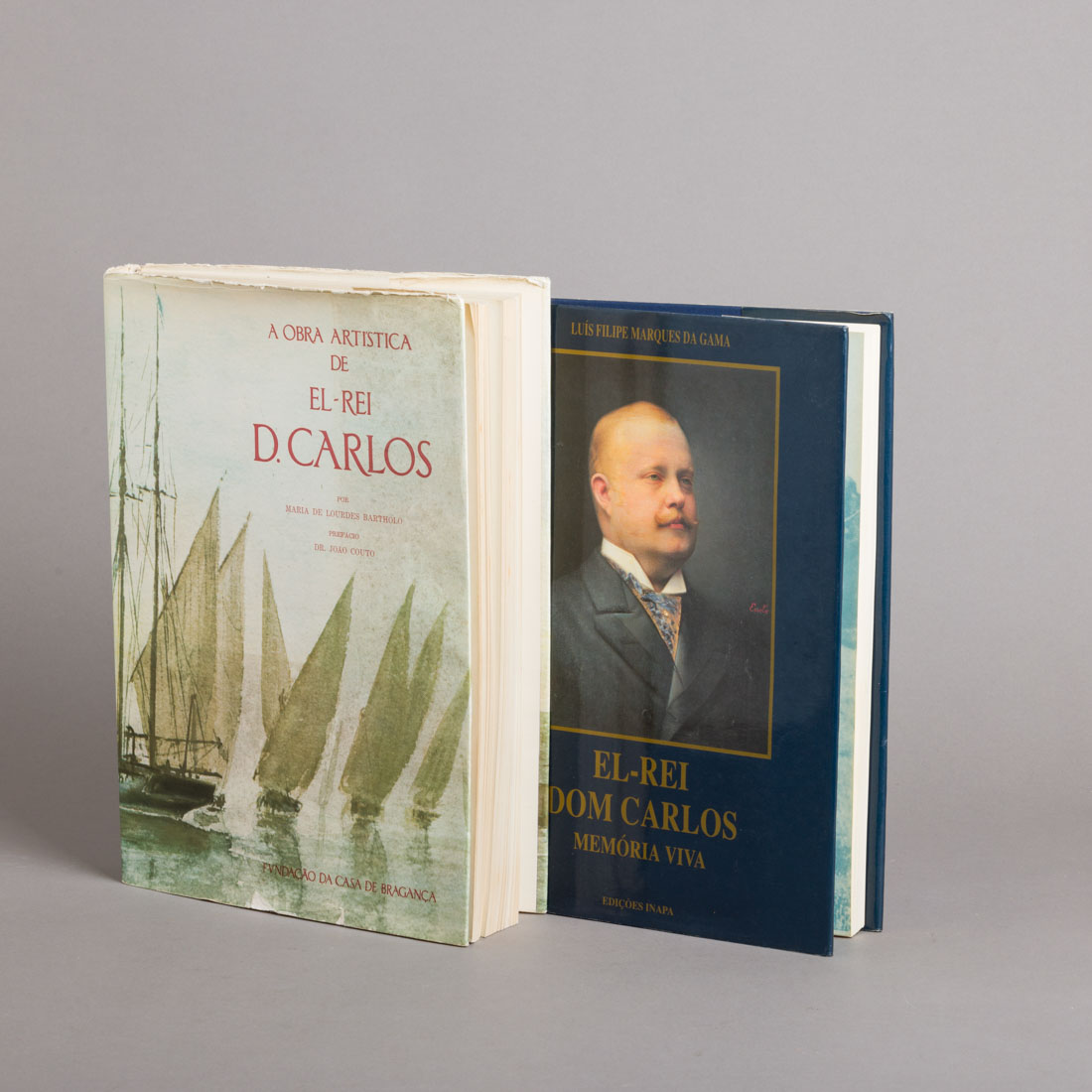 "El-Rei Dom Carlos Memórias Vivas" No Centenário do Clube Tauromáquico -1892-1992 por Luís Filipe Marques da Gama, Edições Inapa, Lisboa 1991, e "A Obra Artística de El-Rei D. Carlos" por Maria de Lourdes Bartholo, prefácio Dr. João Couto. Fundação da Casa de Bragança, Lisboa 1963. Sobrecapa com pequenos defeitos e picos de acidez.