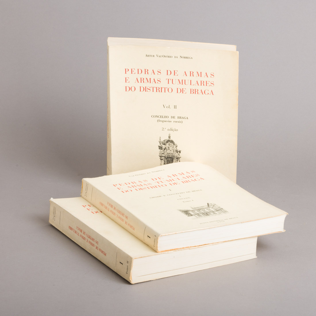 Vaz-Osório da Nóbrega. Volume I, tomo I Cidade e Concelho de Braga, volume I tomo II Cidade de Braga, volume II Concelho de Braga (freguesias rurais) 2ª. Edição. Numerados, estando os dois primeiros assinados a carimbo pelo autor. Anos 1970; 1971 e 1980. Em brochura. Sinais de uso.
