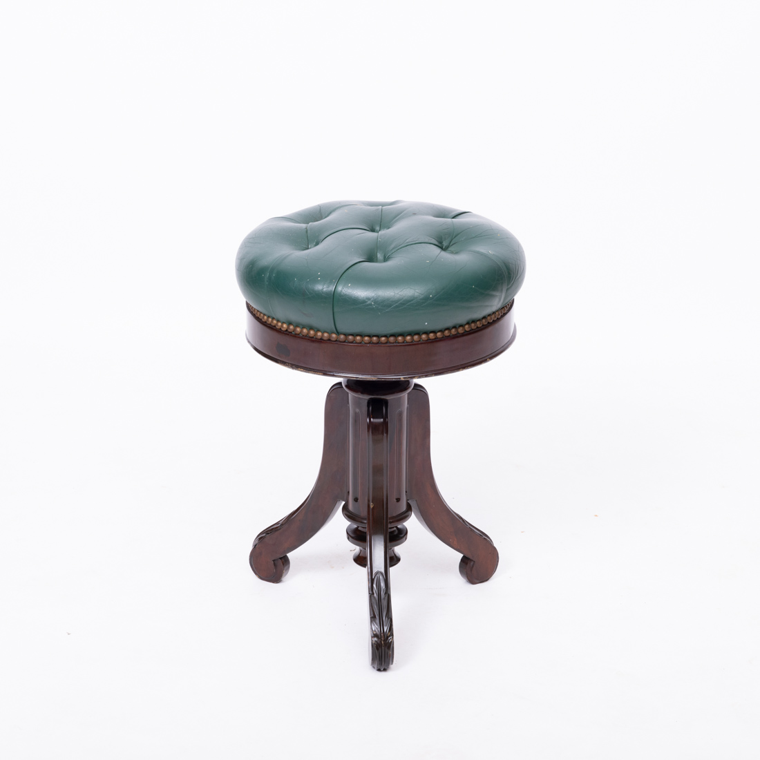 Em pau santo e outras madeiras, assento estofado a pele sintética verde "capitonê". Ajustável. Pequenos defeitos.