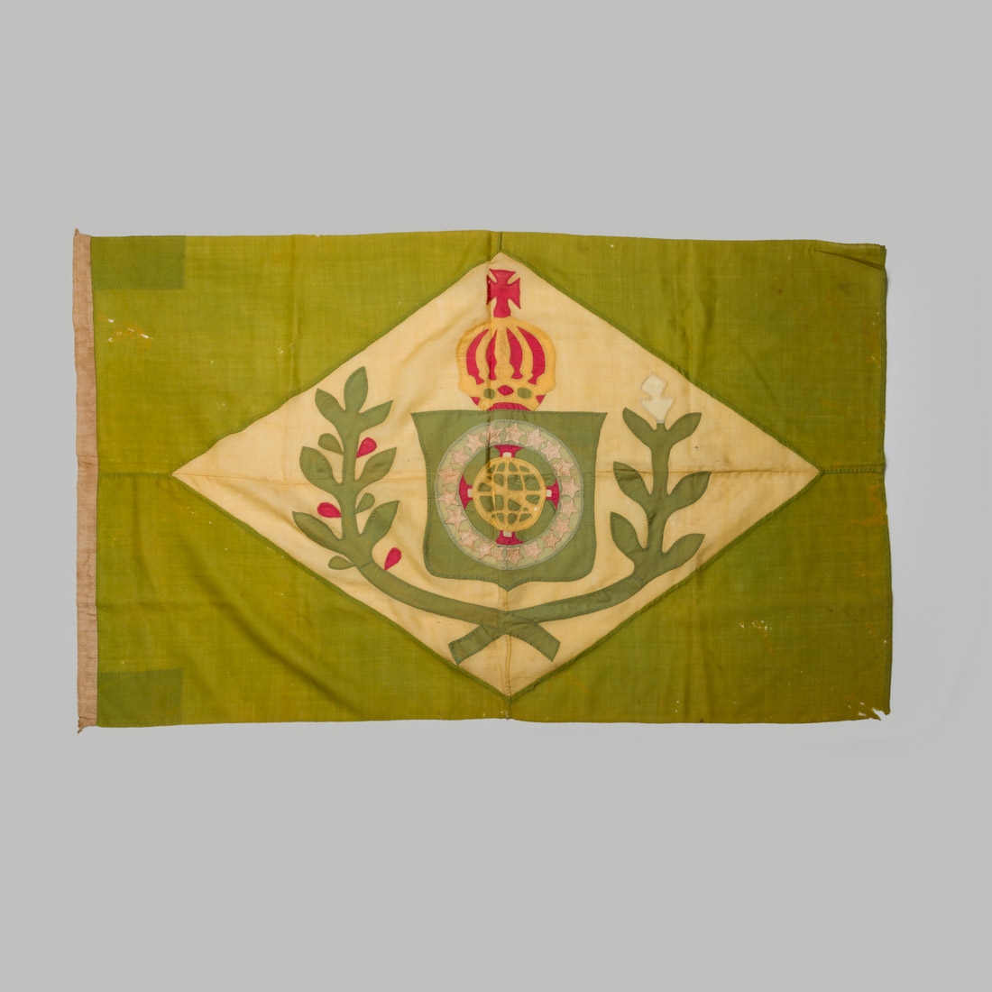 Do Séc. XIX. Composta por um paralelogramo verde dentro do qual se inscreve um losango amarelo, e tendo ao centro as Armas Nacionais do Império: a Esfera Armilar atravessada pela Cruz de Cristo, à volta da qual um listel azul com 19 estrelas brancas, em escudo verde encimado por Coroa Imperial e ladeado por ramos de tabaco e de café unidos pelo Laço da Nação. Em linho. Sinais de uso, manchas, falhas e defeitos.