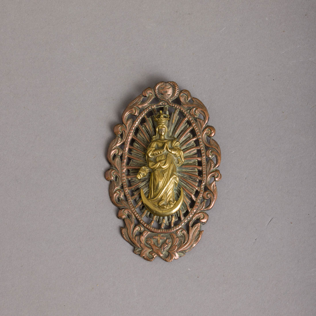Placa de suspensão, em metal amarelo e cobre, decoração relevada e vazada. Séc. XVII/XVIII. Leves amolgadelas e pequenos defeitos.