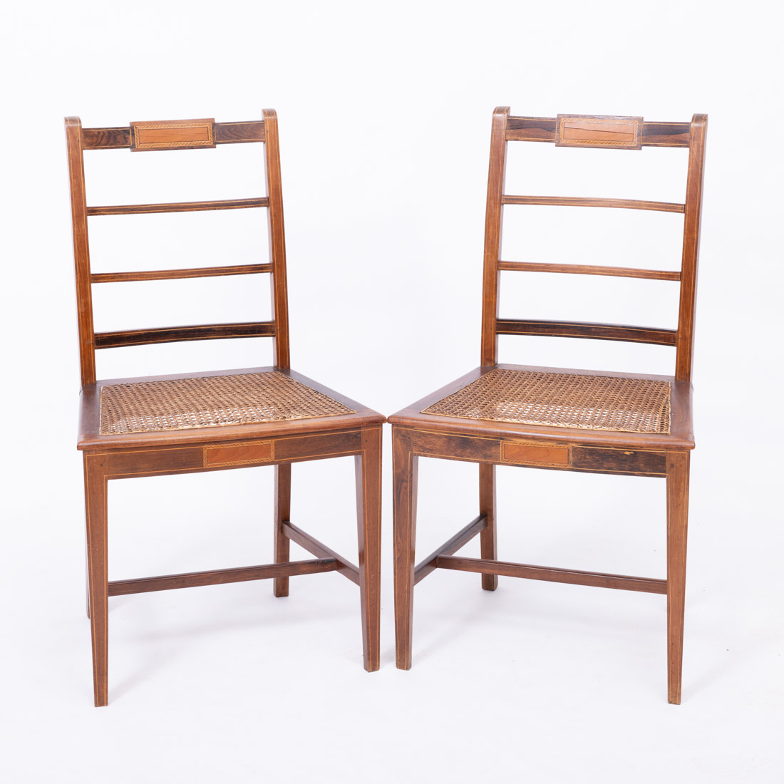 Em pau santo e outras madeiras com marchetaria, fundos em palhinha. Sinais de uso, pequenos defeitos.