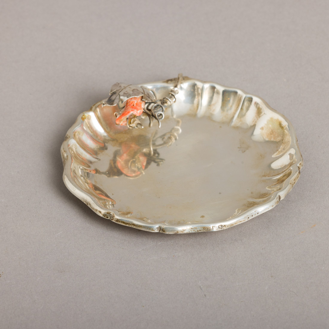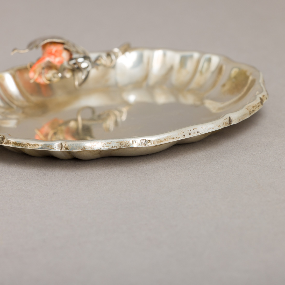 Em prata portuguesa contraste águia (pós 1985) de 925, marcada "LF", aplicação de folha e peça em coral do mediterrâneo. Falha no coral e leves pontos de oxidação.