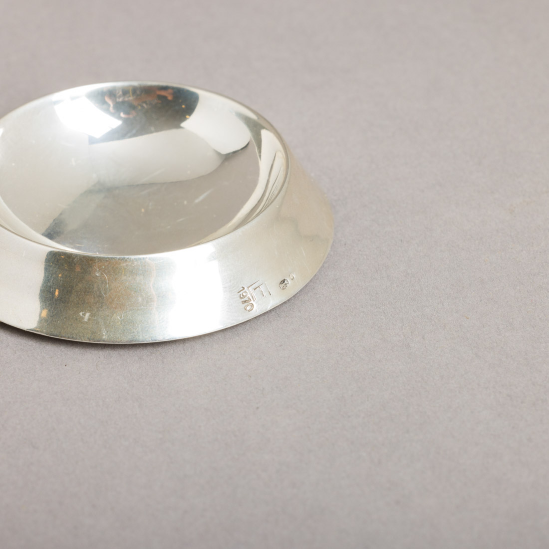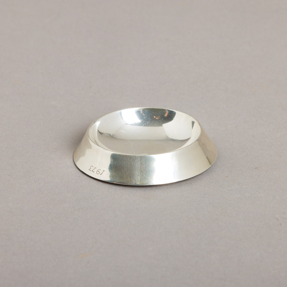 Em prata portuguesa contraste águia (1938-1984) de 833, marcada "LF" e marca de ourives do Porto José Pereira Reis (1916-1990), decoração lisa, data gravada. Sinais de uso.