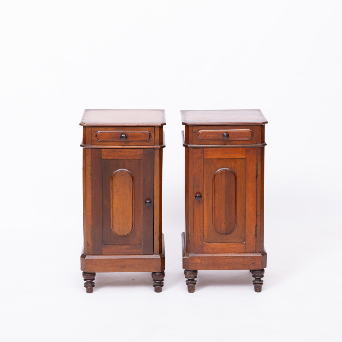 Em diferentes madeiras com porta e gaveta, pés e puxadores torneados. Pequenas falhas e defeitos.