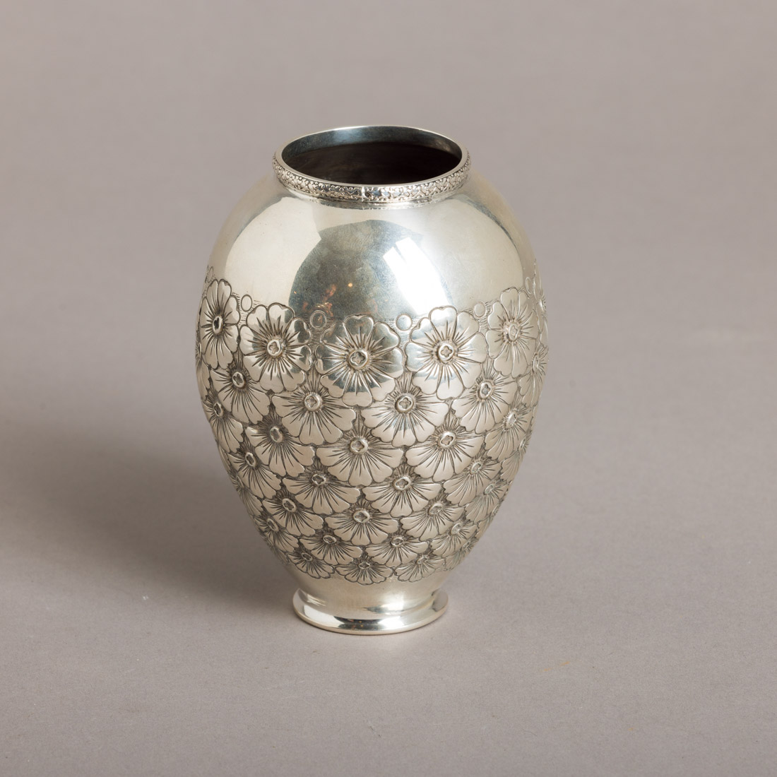 Em prata portuguesa contraste águia (1938-1984) de 833, decoração relevada "malmequeres". Sinais de uso, pequenas amolgadelas.