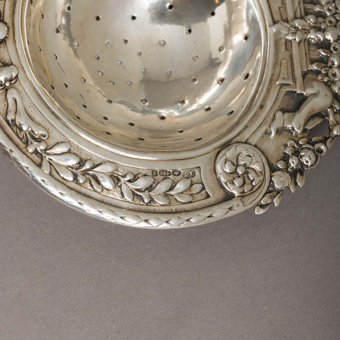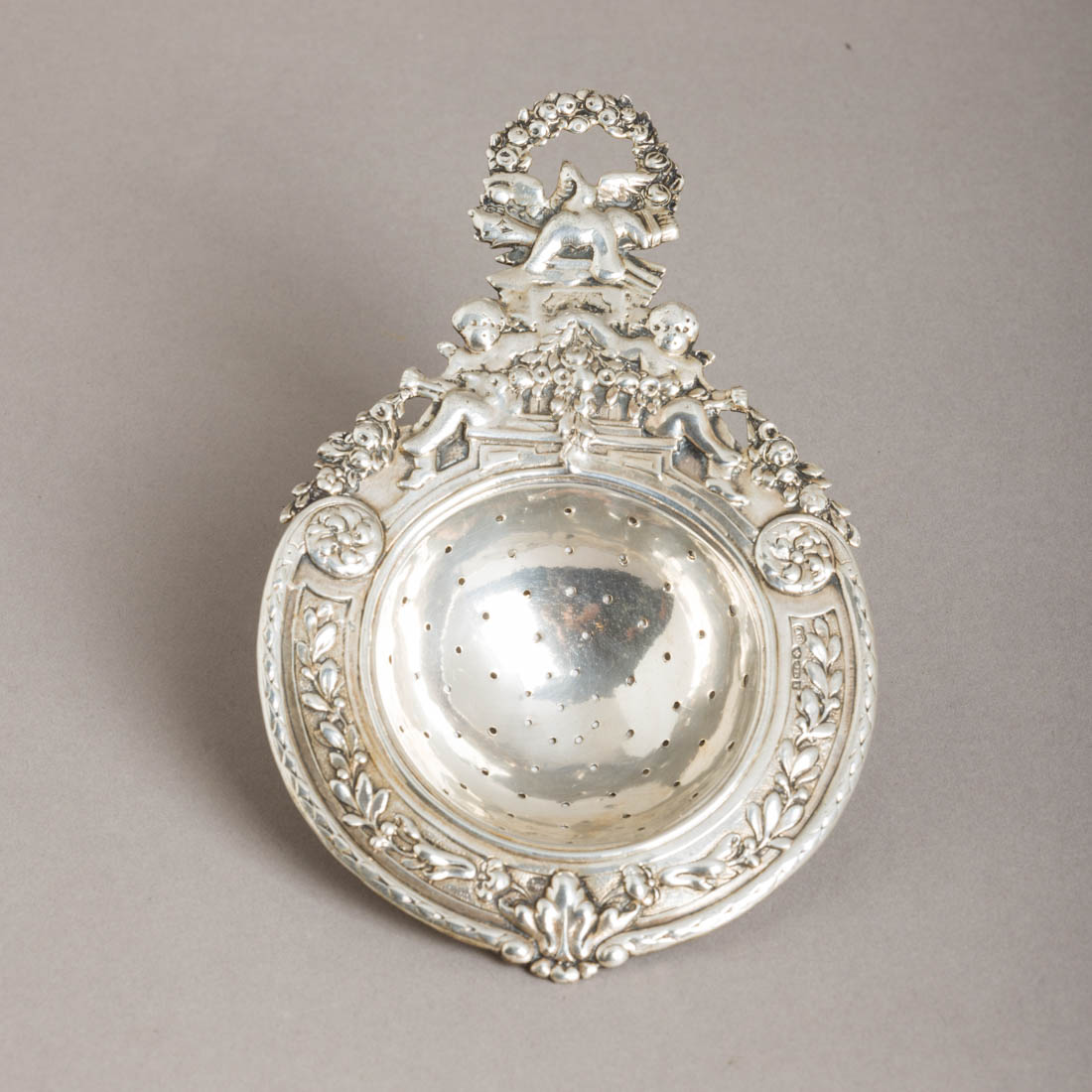 Em prata de 925, marcas não identificadas, decoração relevada "Putti e elementos vegetalistas". Sinais de uso, restauro na pega.