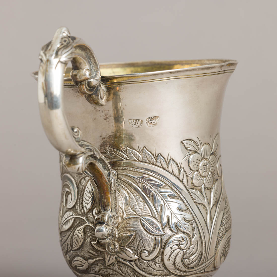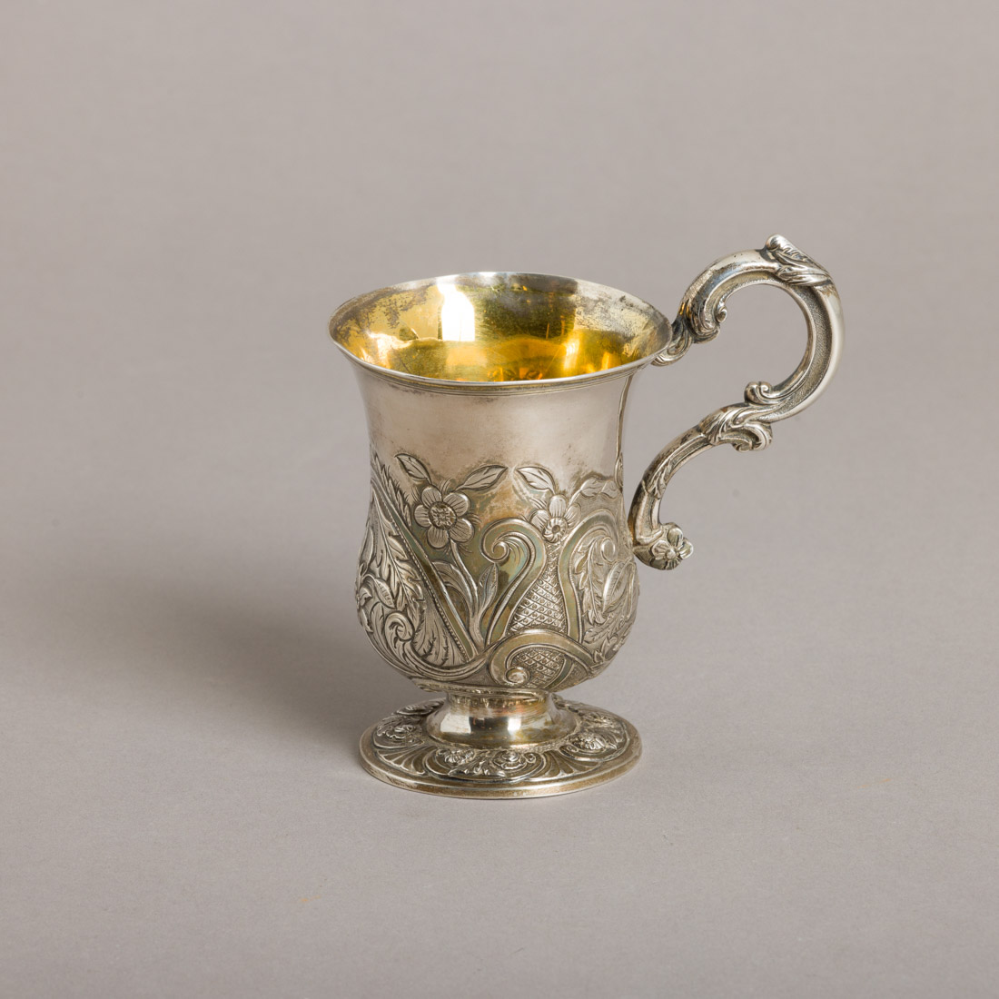 Em prata portuguesa do séc. XIX, marca de ensaiador do Porto (P-35) Luís António Rodrigues e de ourives (P-127) António José Martins, decoração relevada "flores e enrolamentos". Amolgadelas.