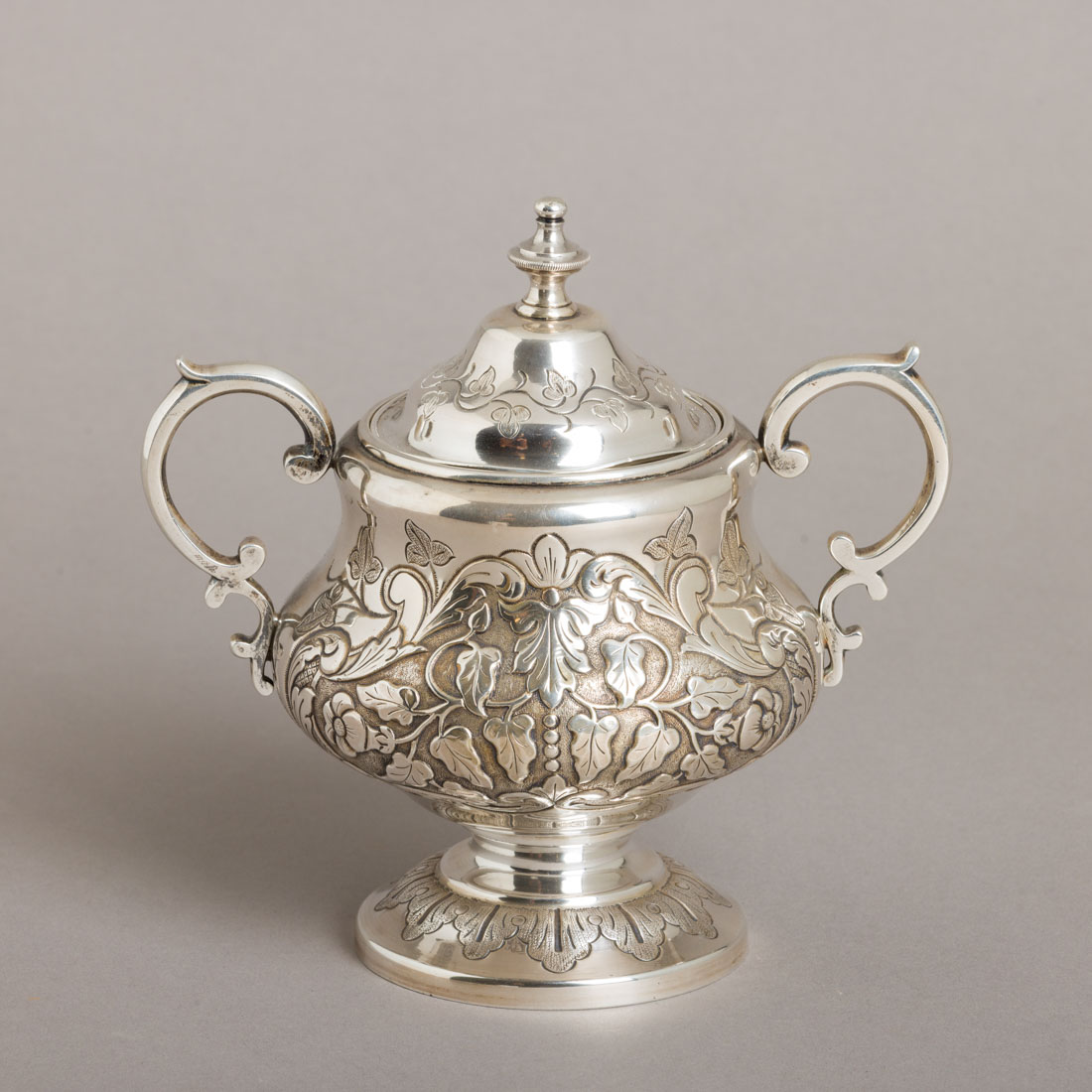Em prata portuguesa contraste javali (1887-1937) de 833, decoração relevada e gravada com elementos vegetalistas. Sinais de uso, amolgadelas na tampa.