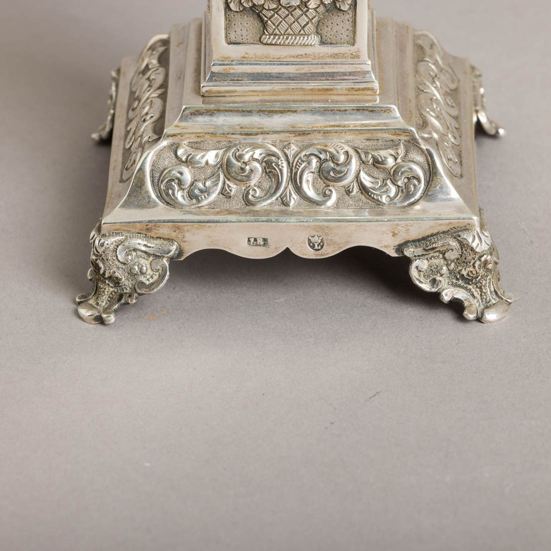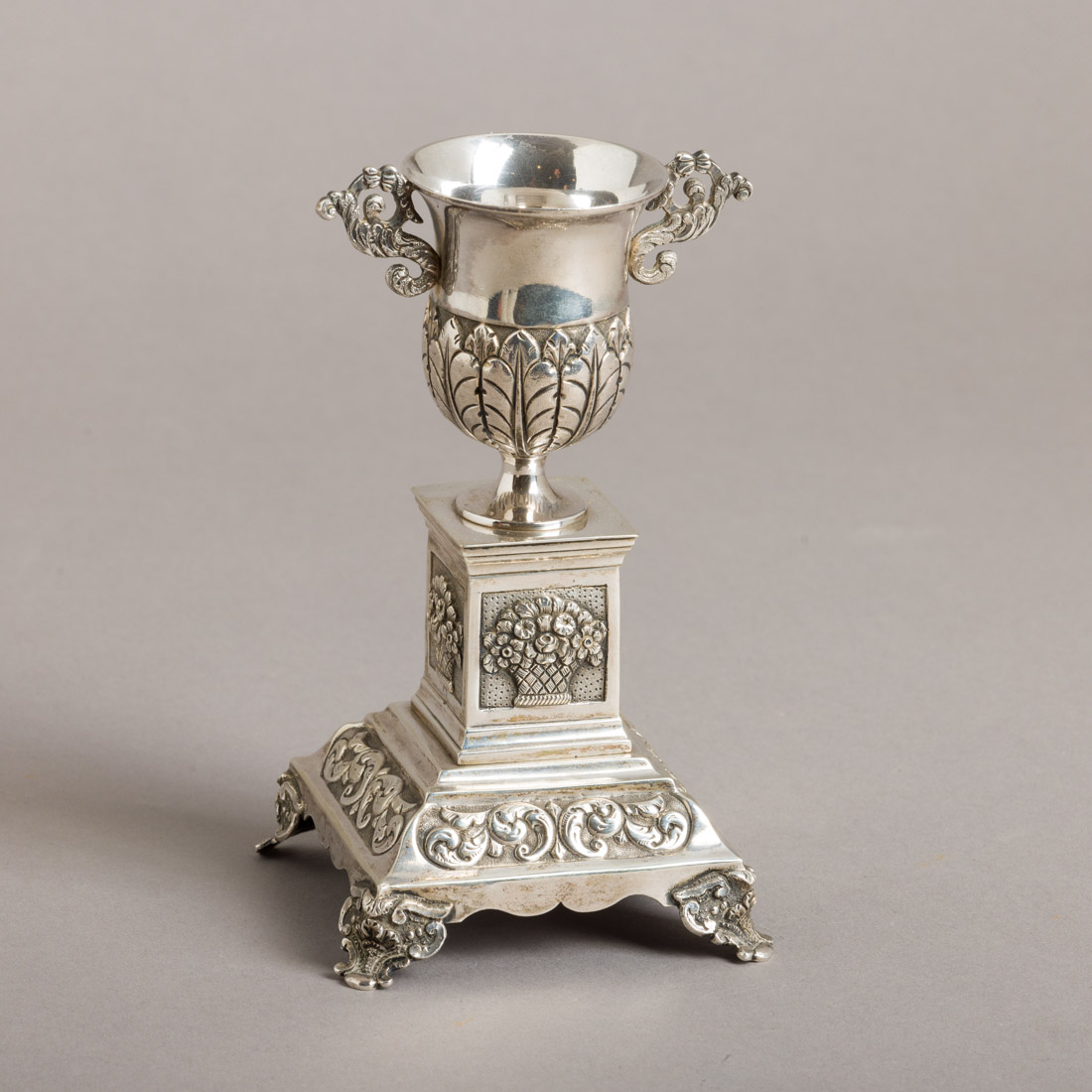 Em prata portuguesa do Séc. XIX, marca de ensaiador de Lisboa (L-46) Joaquim Miguel Gonzaga da Costa e de ourives (L-377) datável de 1810-1881, decoração relevada com elementos vegetalistas. Sinais de uso.