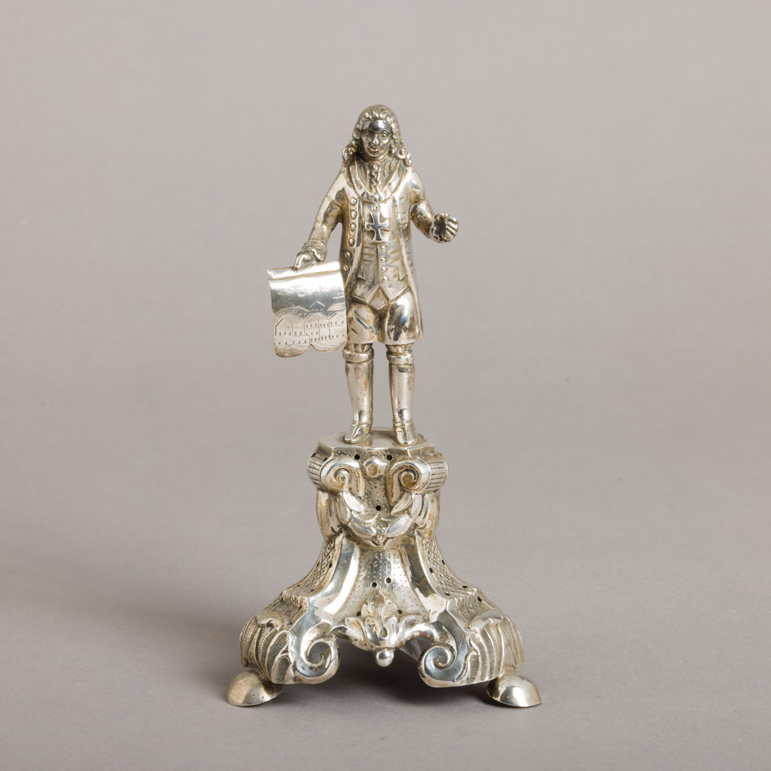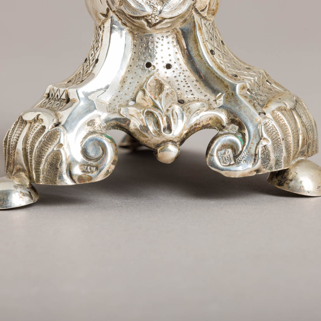 Em prata portuguesa do Séc. XIX, marca de ensaiador do Porto (P-58) José Rodrigues Teixeira e de ourives (P-378) Joaquim António Martins, decoração relevada e gravada, base recortada. Sinais de uso, pés com amolgadelas.
