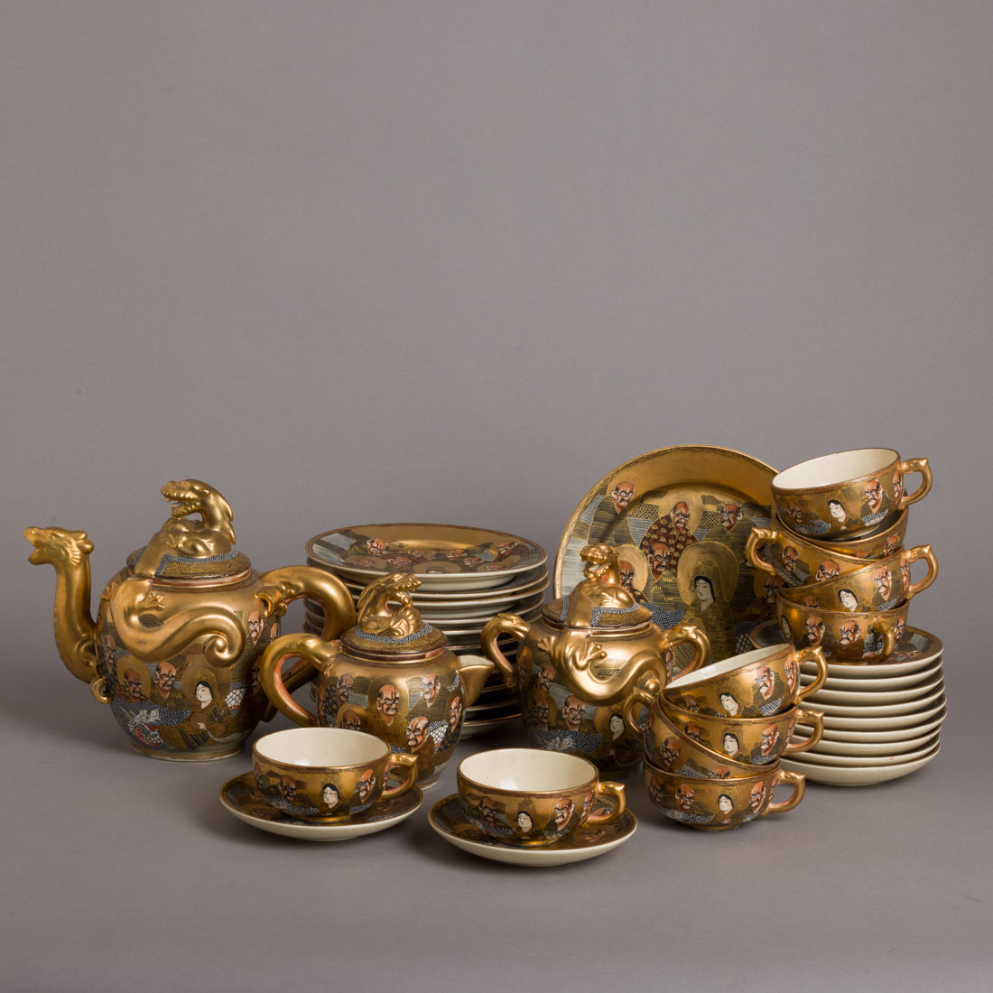 Em cerâmica japonesa de Satsuma, decoração policromada e dourada "figuras" e dragões em relevo. Composto por bule, leiteira, açucareiro, 11 chávenas com pires, prato de torradas e 11 de doce. Sinais de uso, 1 chávena sem asa e outra com pequena esbeiçadela.