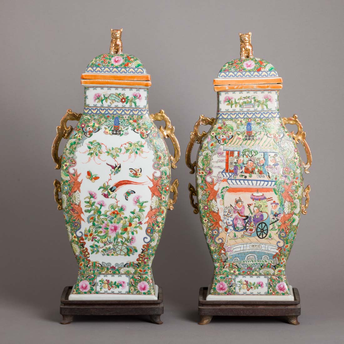 Em porcelana da China, decoração policromada e dourada "flores, insectos e figuras em cenas do quotidiano", tampa encimada com cão de foo. Base em madeira. Sinais de uso.