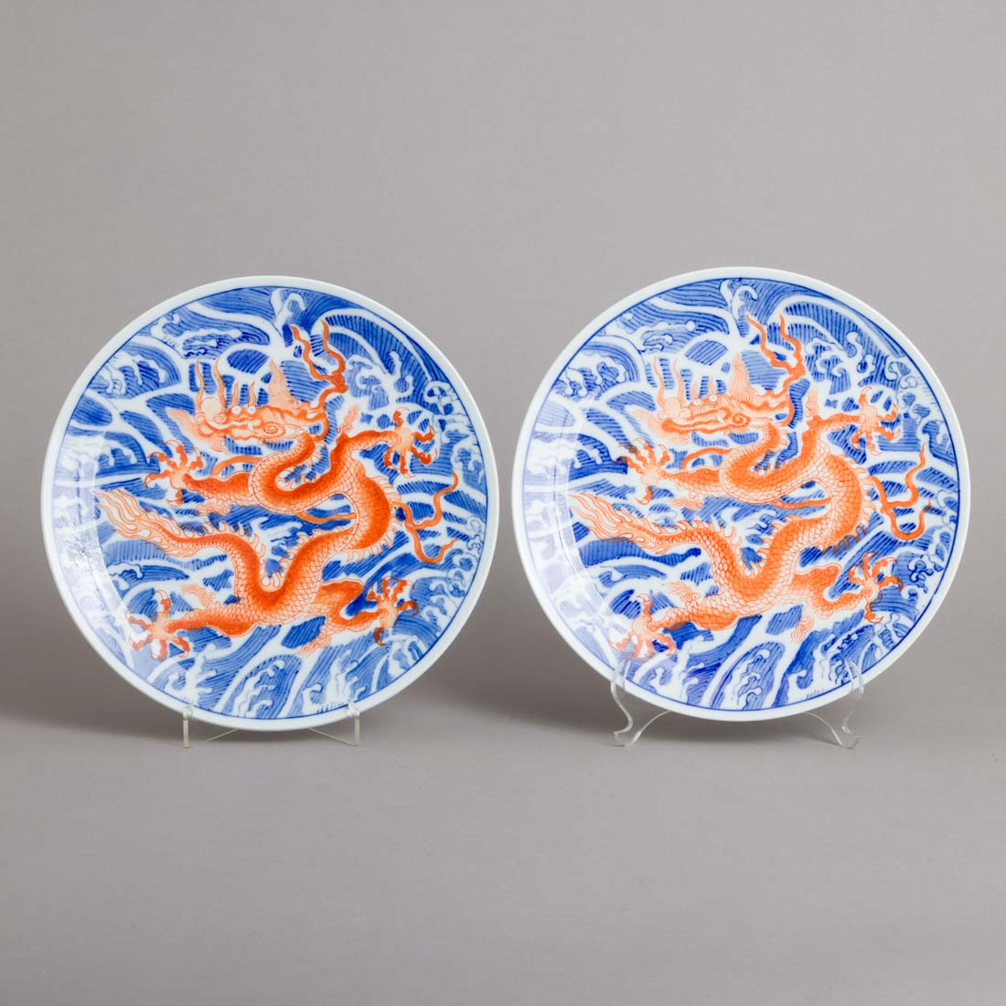 Em porcelana de China, decoração a azul e a rouge de fer "dragões". Marcados. Sinais de uso.
