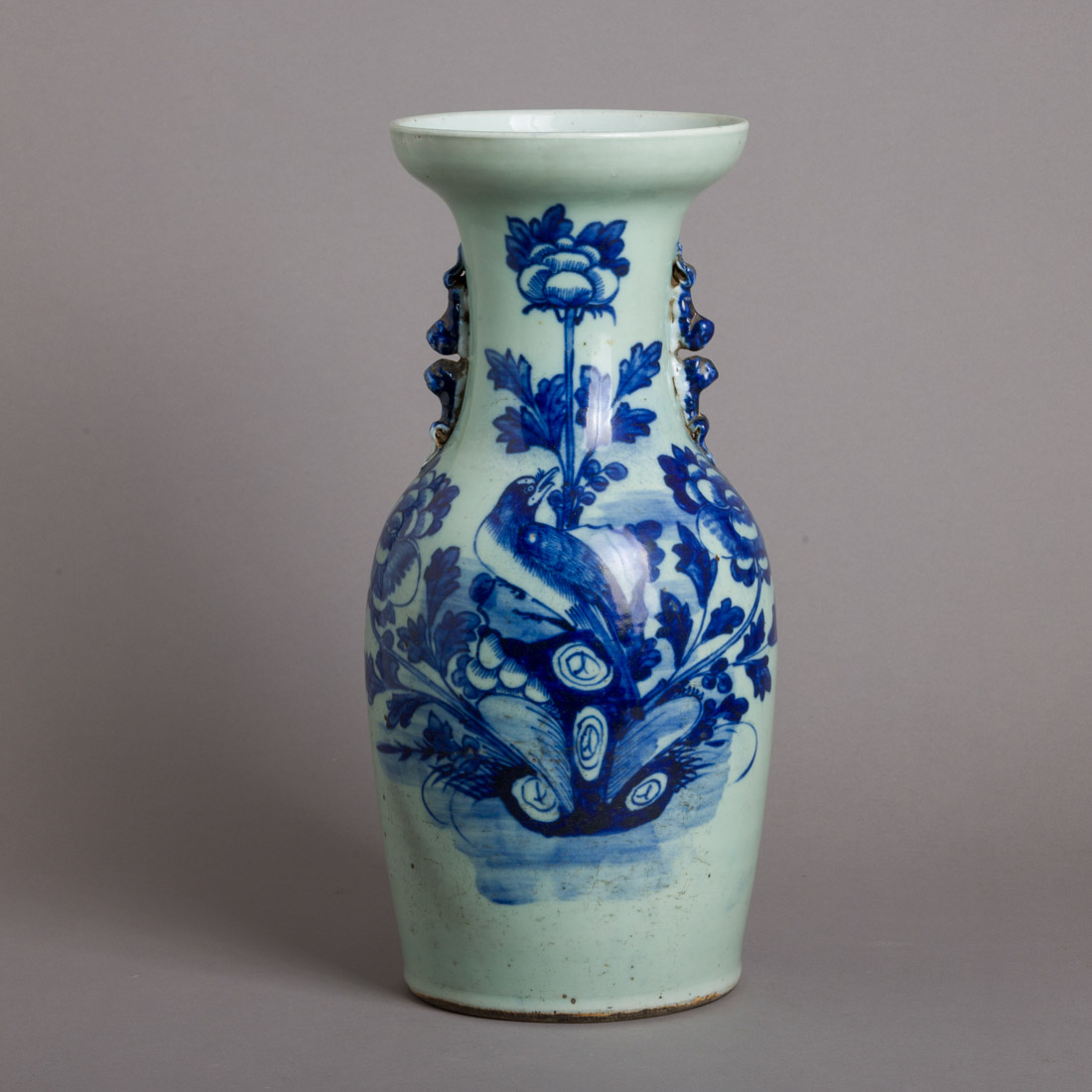 Em porcelana da China, decoração a azul "flores e pássaro", sobre fundo Celadon, asas relevadas com animais. Desgaste e cabelos no fundo.